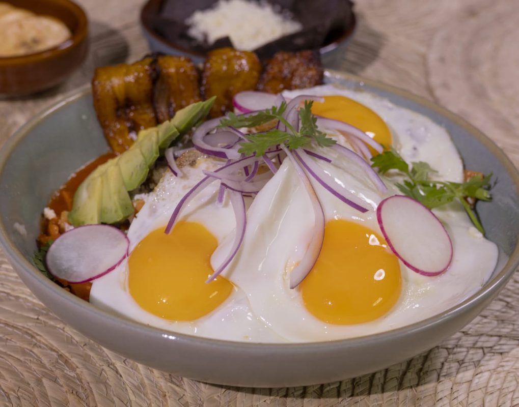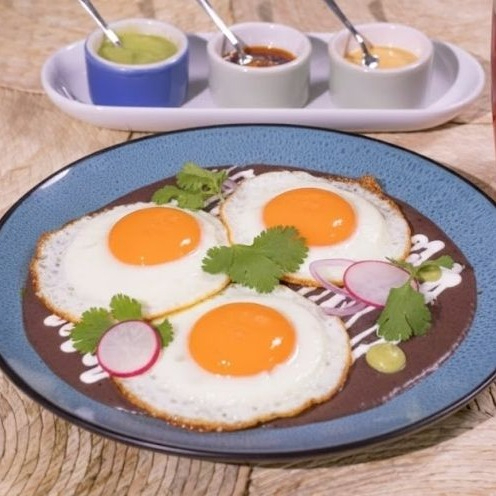 Cinco piezas de tortilla pasadas por aceite, bañadas con frijol, servidas con crema, cebolla, queso y tres piezas de huevos estrellados.