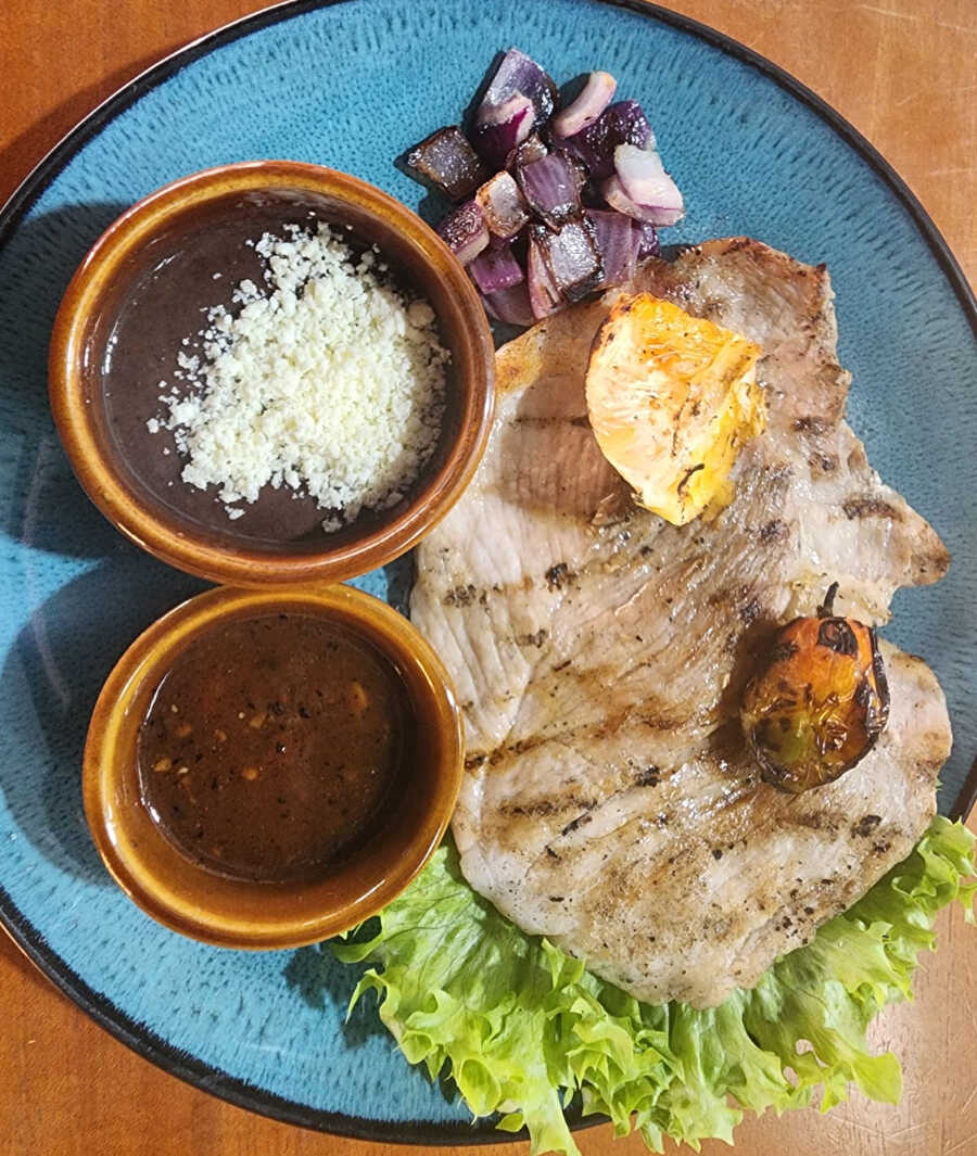 200 grs. de carne de cerdo cocida al carbón, acompañado con frijol, cebolla asada, salsa de tomate tatemada y tortillas.