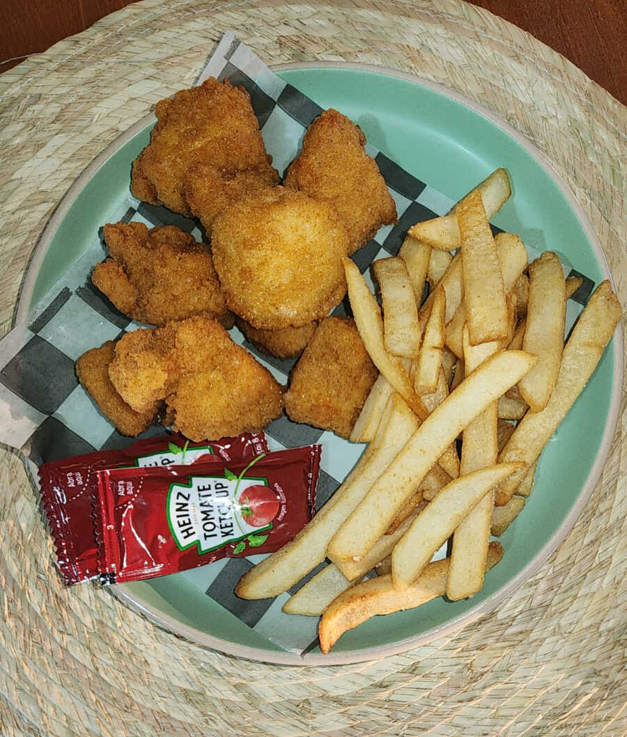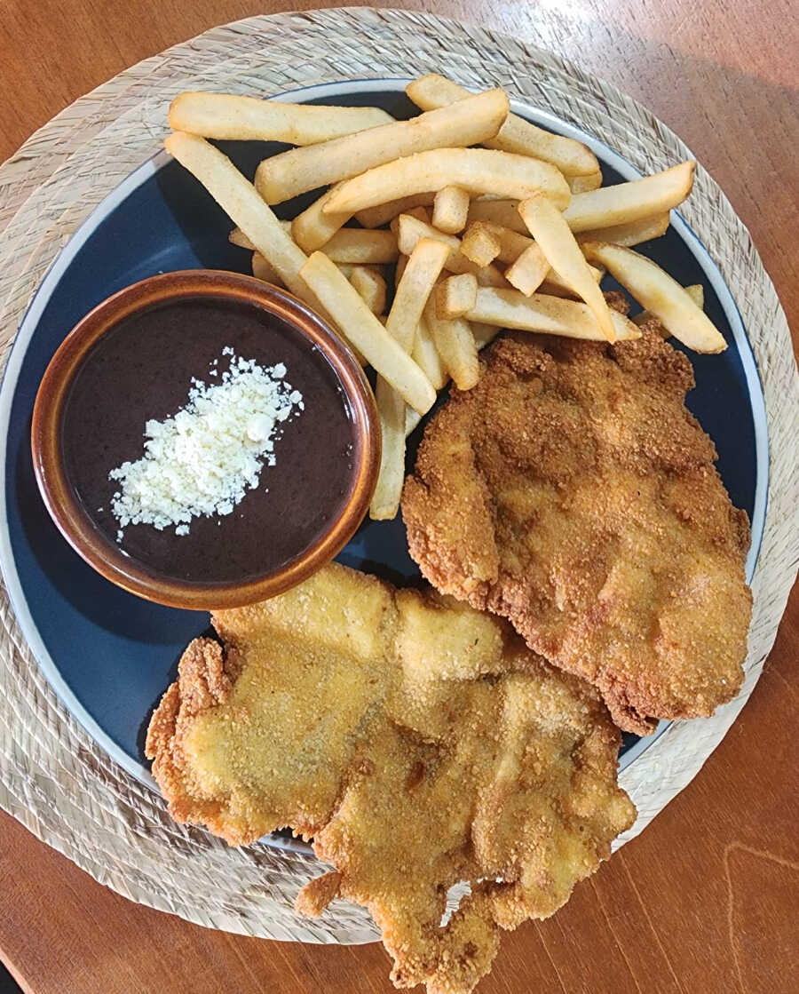 Milanesa de pollo empanizada, servida con dos guarniciones.