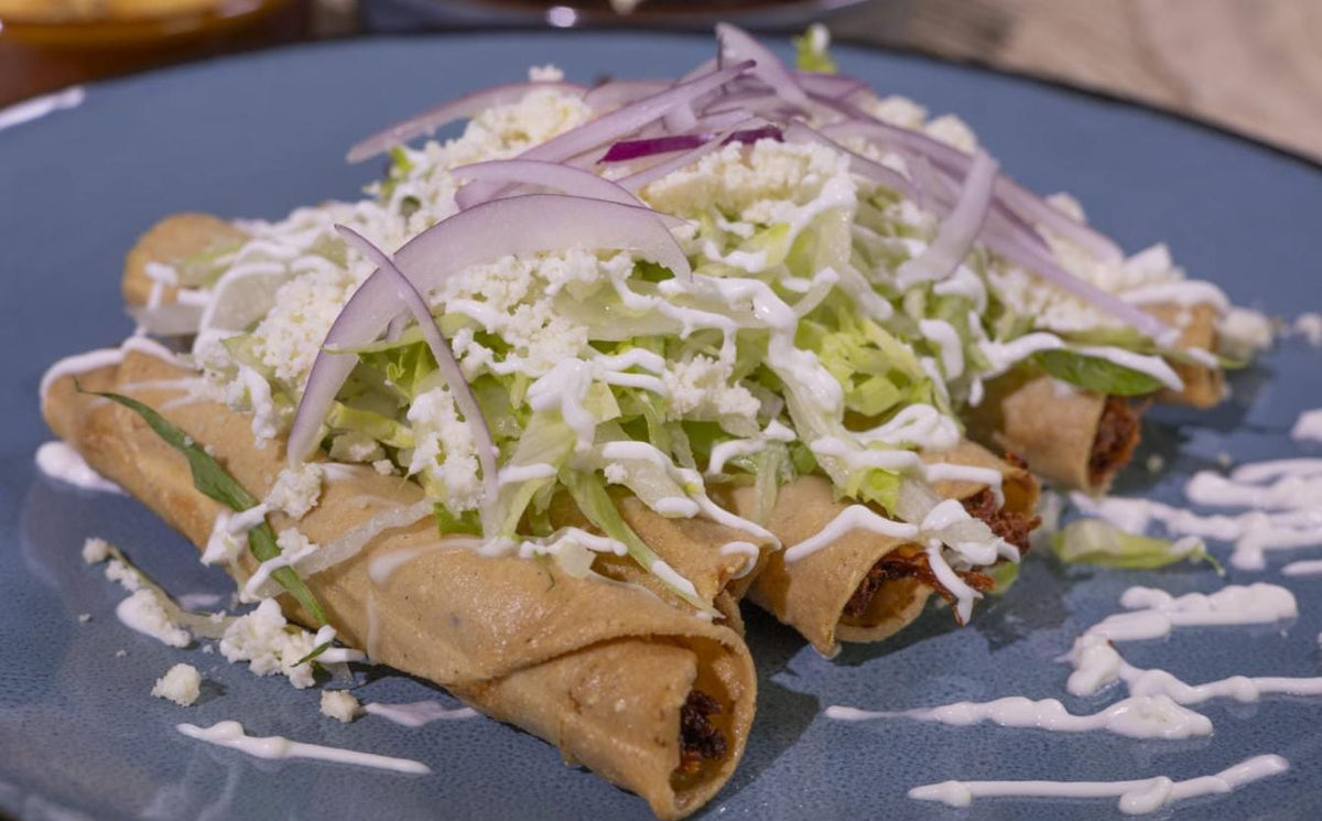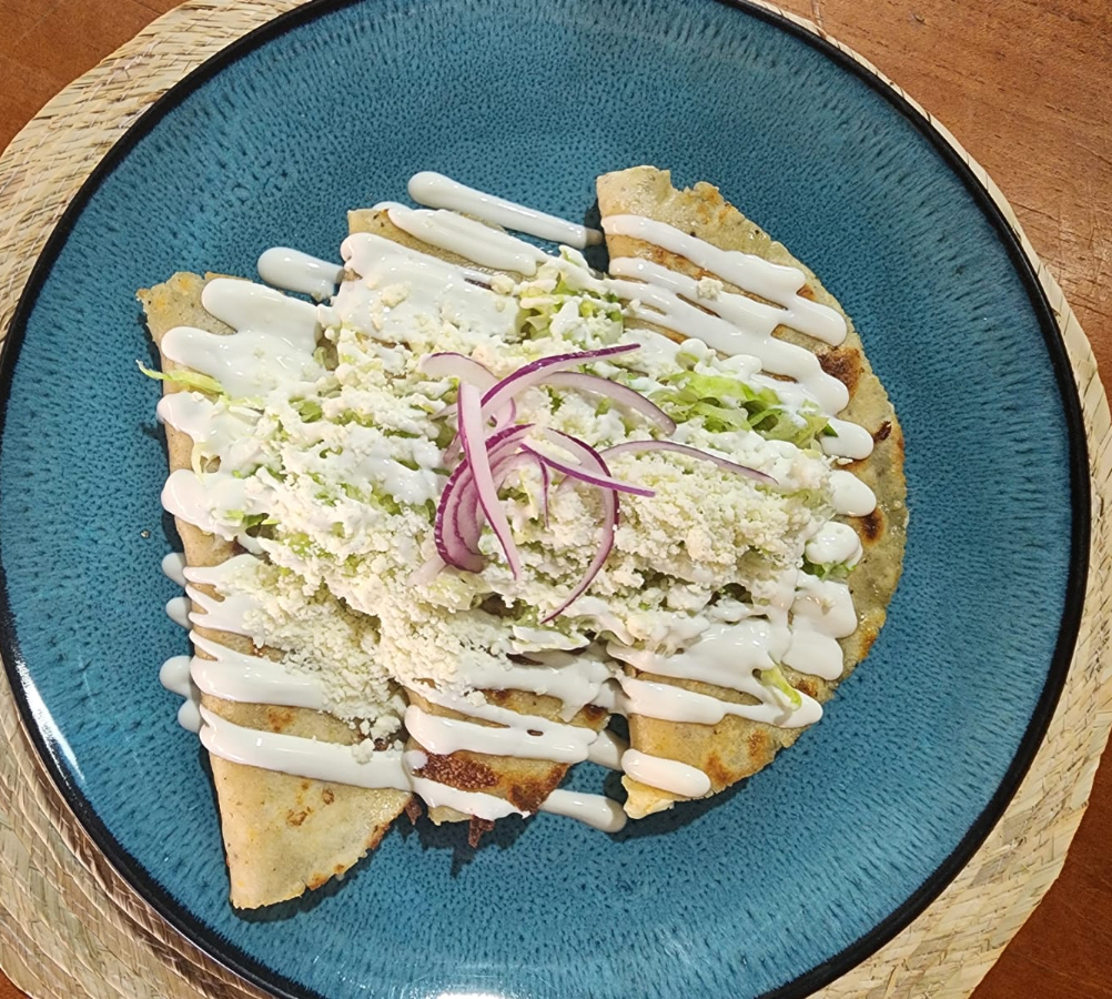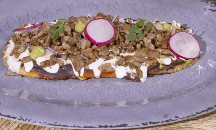 Tortilla alargada hecha a mano, cubierta con manteca de cerdo, servida con frijol, salsa de tomate, queso de hebra, lechuga, crema, cebolla y aguacate.