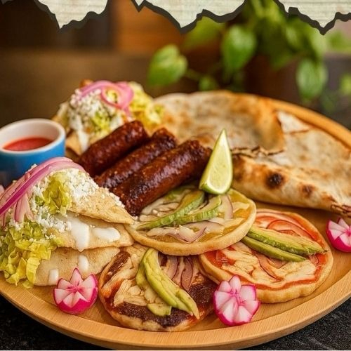 Tres picadas (roja/verde/mole), tres empanadas de queso, cuatro taquitos dorados rellenos con pollo, una tlayuda y 150gr. de longaniza ahumada.