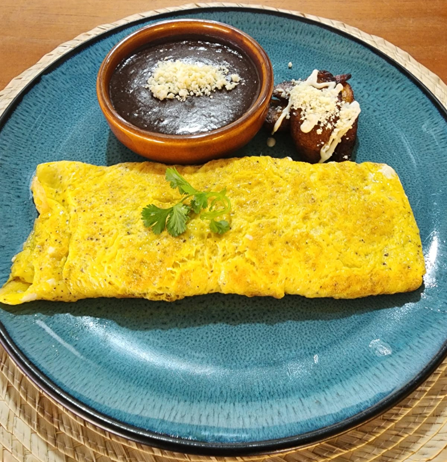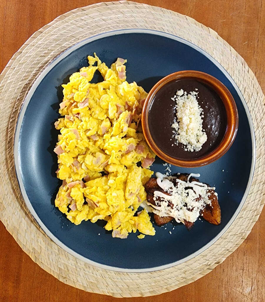 Tres piezas de huevos revueltos, acompañados con platanos fritos, frijol y tortillas.