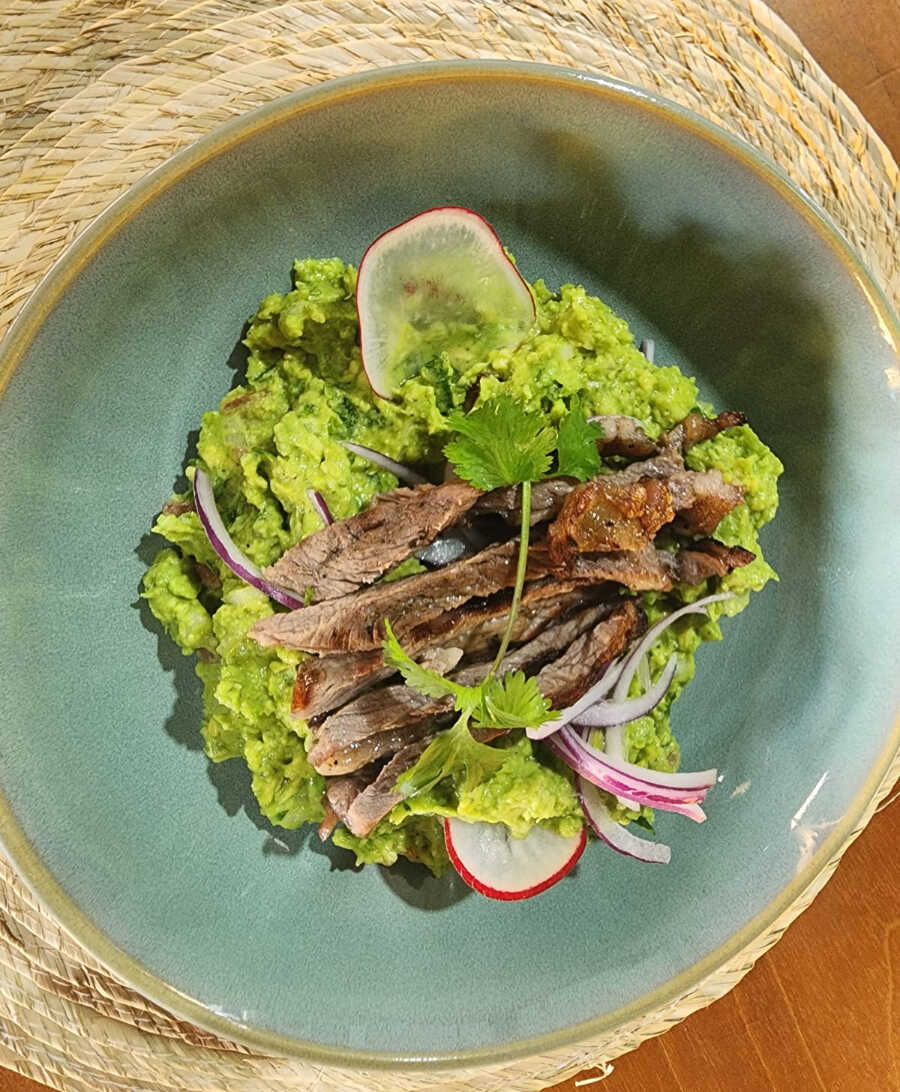 Aguacate machacado con tomate, cebolla, limón y cilantro.
