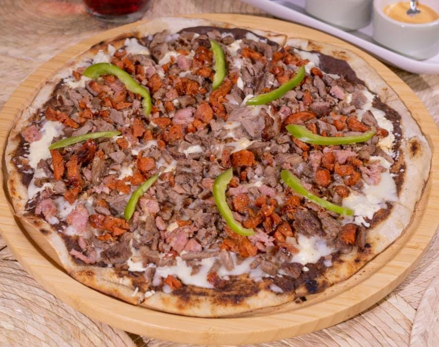 Salsa de tomate de la casa, frijol, queso mozzarella, chistorra, chorizo argentino, picaña y sirloin.