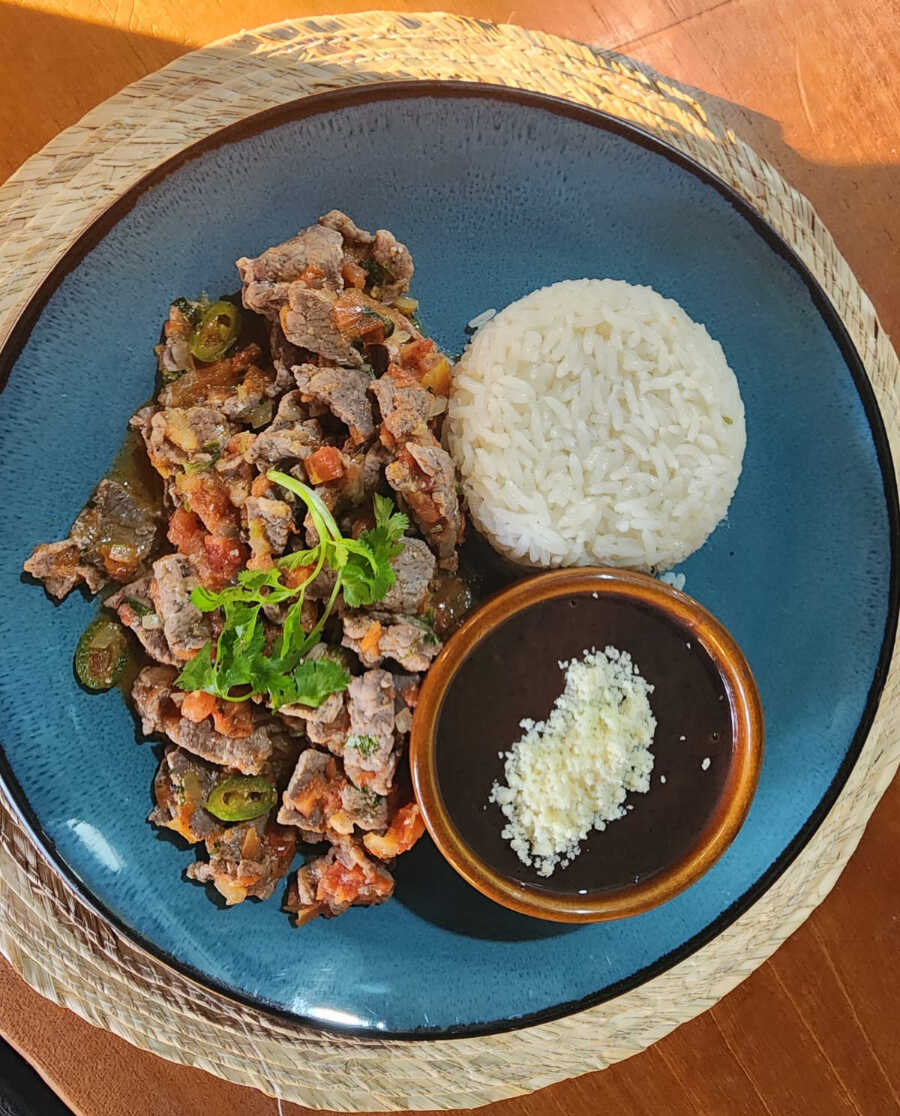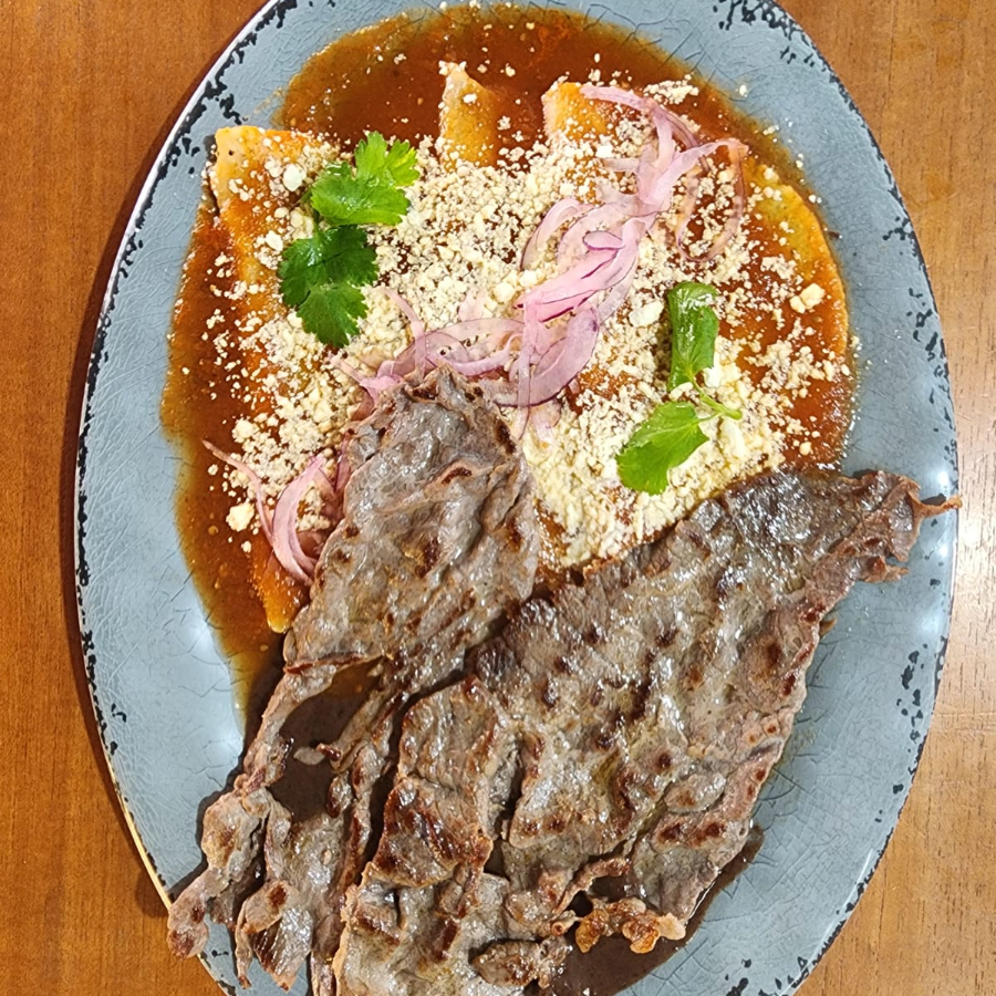 200 grs. de carne de res marinada, salteada con tomate, cebolla, cilantro y chile, acompañado con frijol, arroz y tortillas.