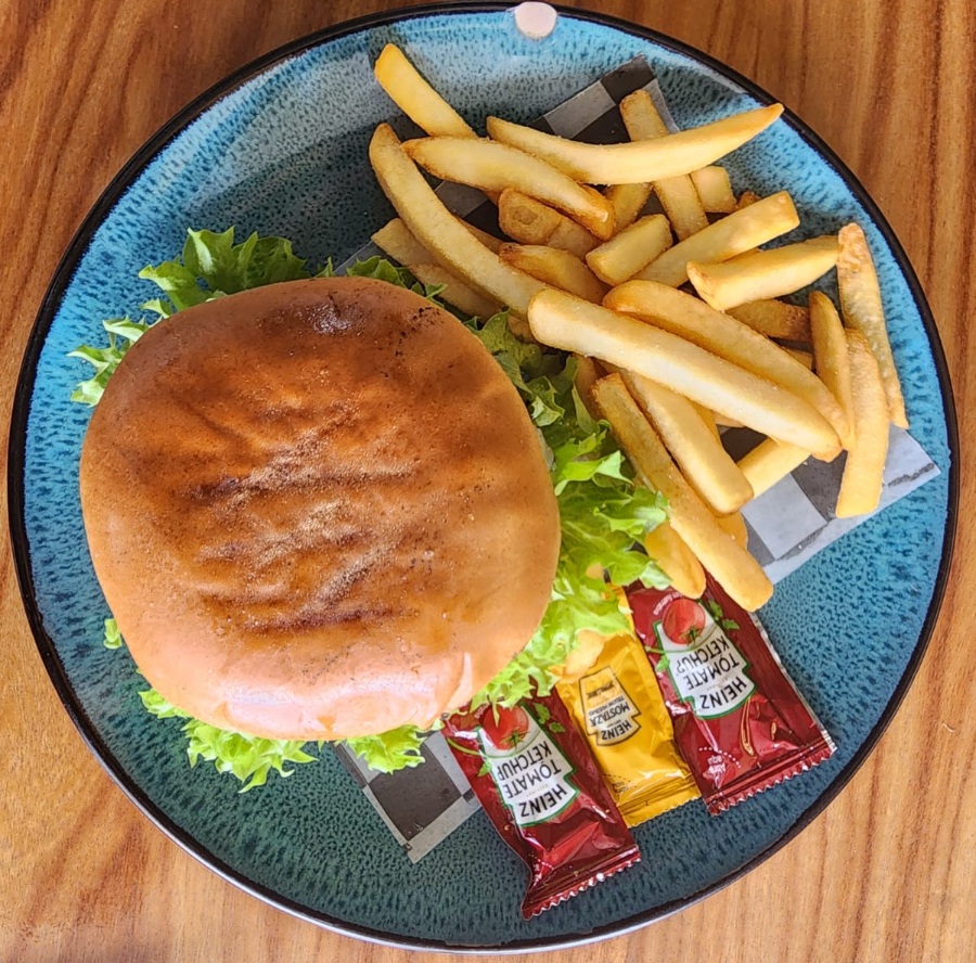 Pan brioche, carne de res, queso americano, queso manchego, tocino, lechuga, tomate y cebolla. Servida con papas a la francesa.