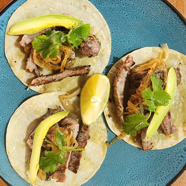 Tres piezas de tacos de sirloin en tortilla de maíz.