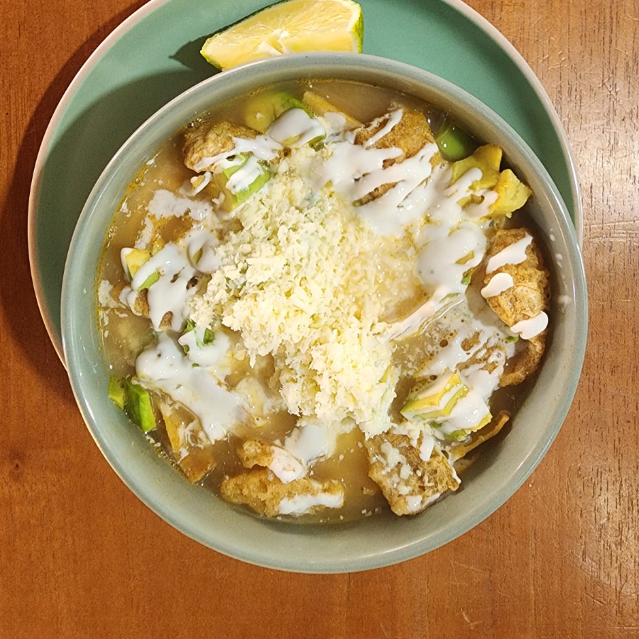 Caldo de pollo sazonado, servido con tiras de tostada, crema, queso de hebra, chicharrón, chipotle y aguacate.