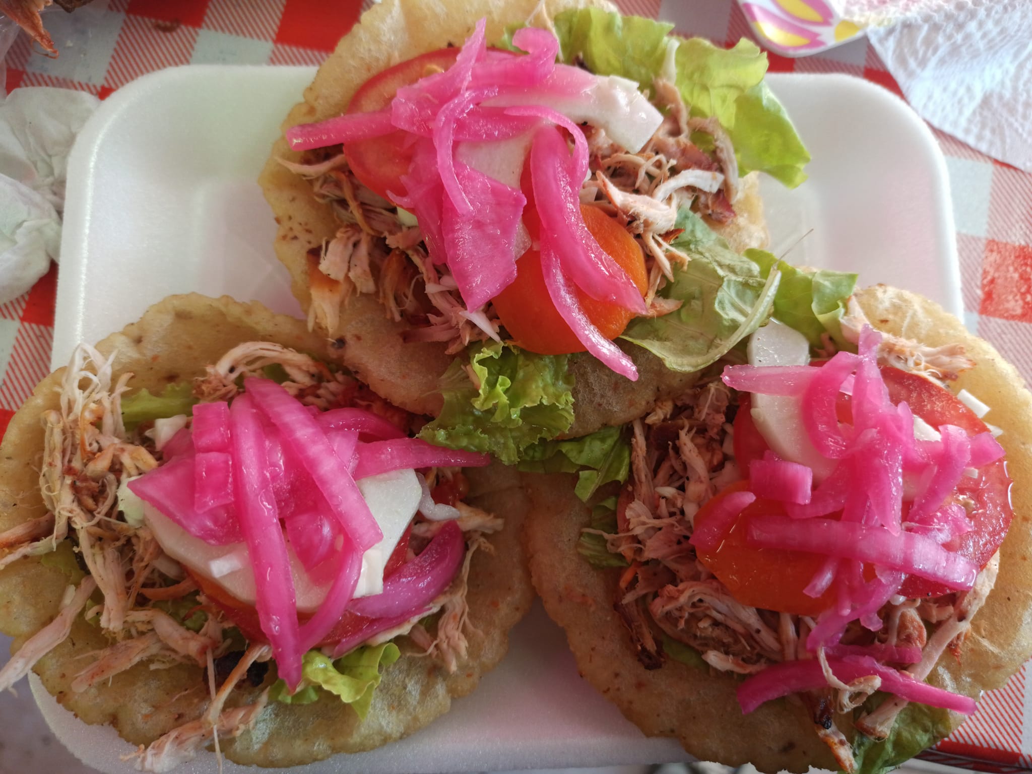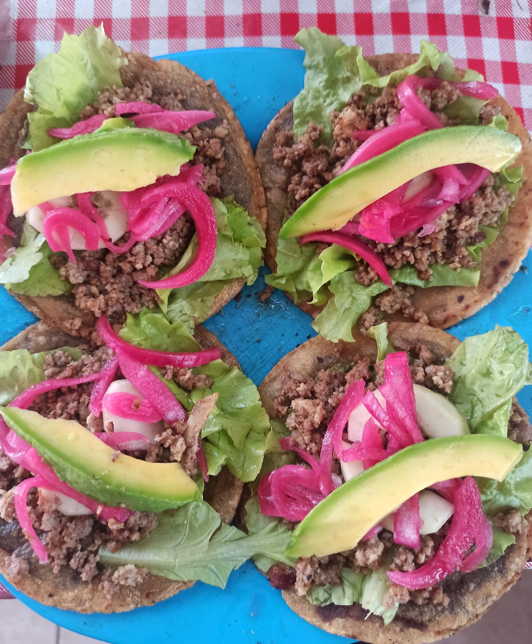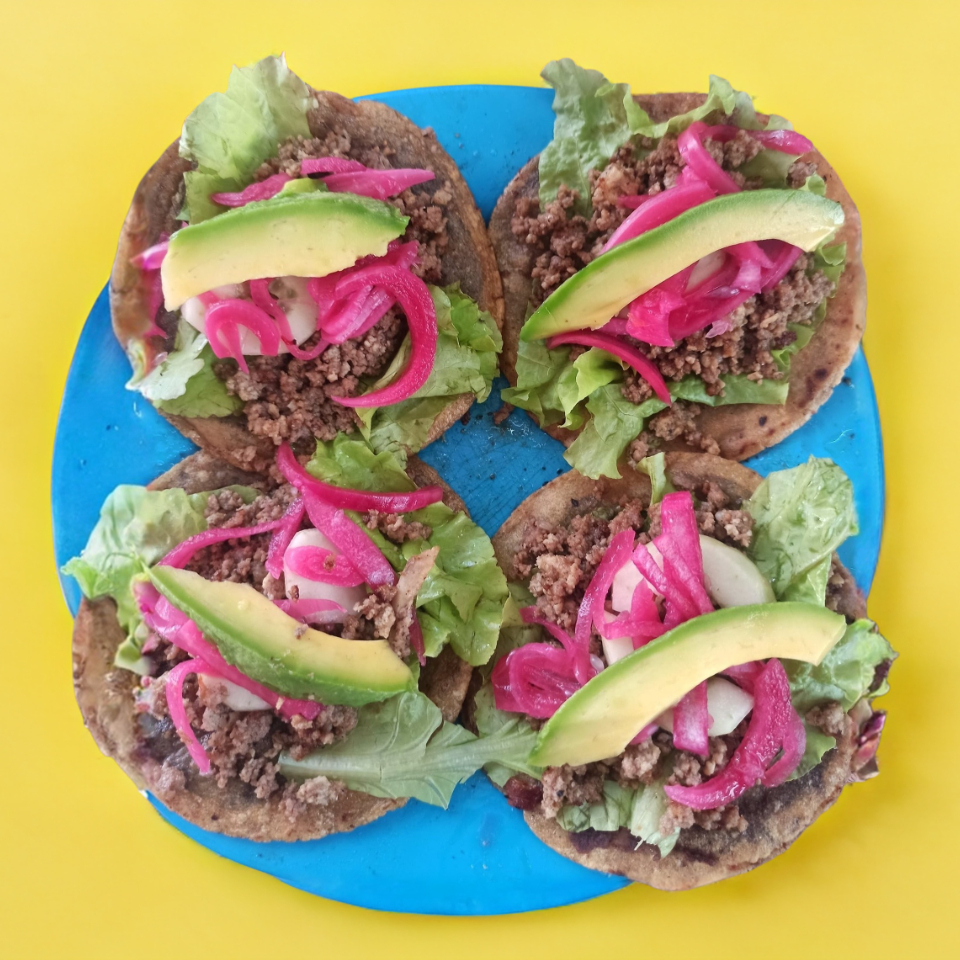 Tortilla de maíz frita, rellena de frijol, acompañada de lechuga fresca, carne molida, repollo, cebolla, aguacate y pepino.