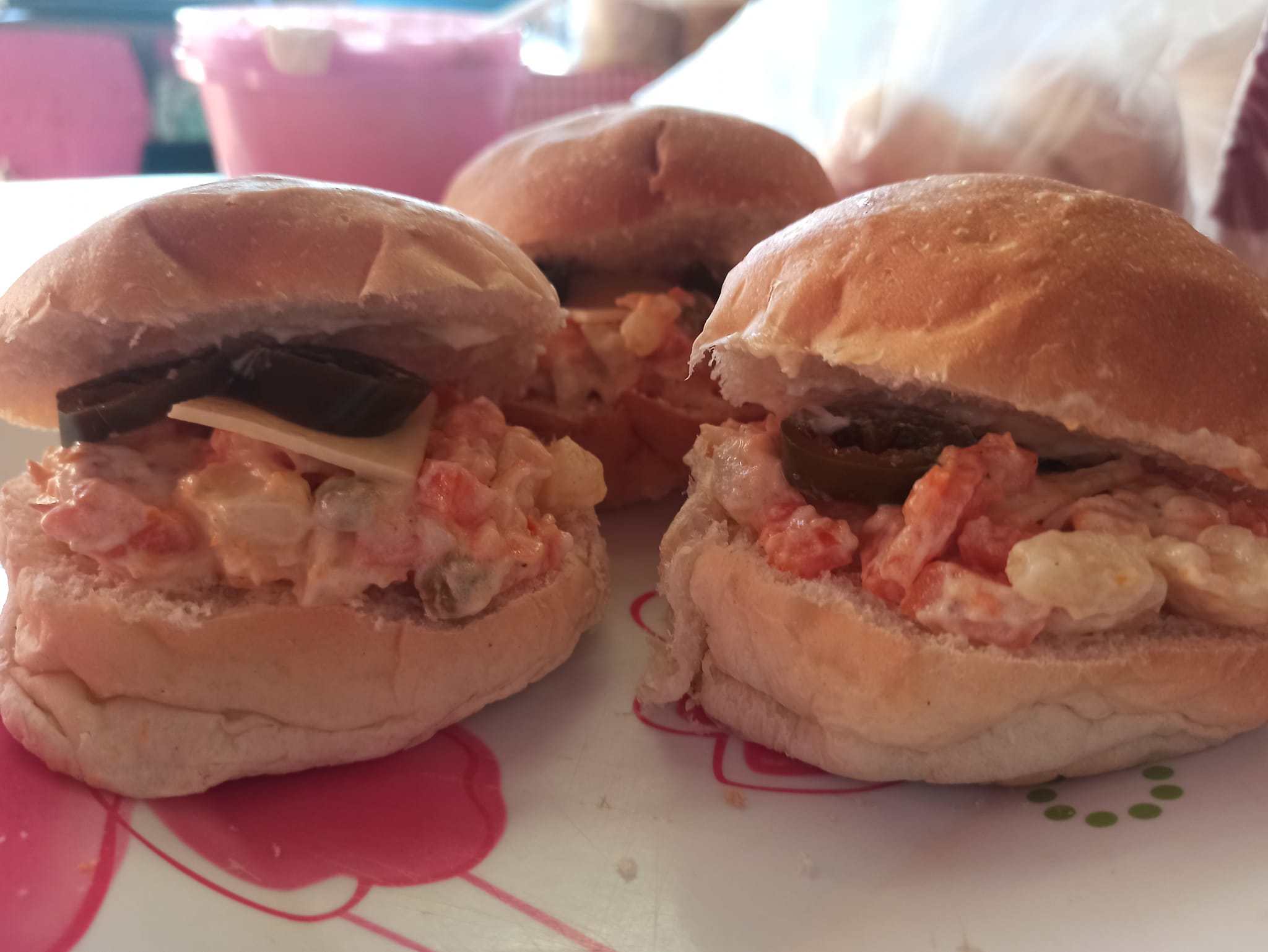 Torta bolita con pollo asado, mayonesa, lechuga fresca, tomate, cebolla y chile.