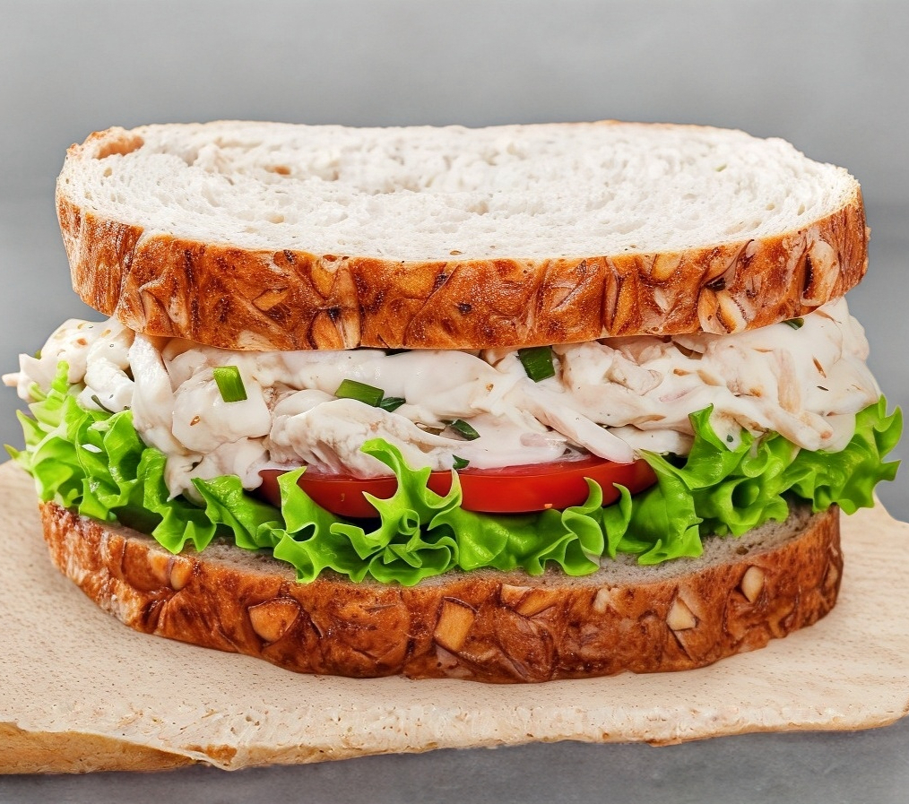 Sándwich de pan integral, lechuga fresca, aguacate, tomate, pollo asado, cebolla y mayonesa.