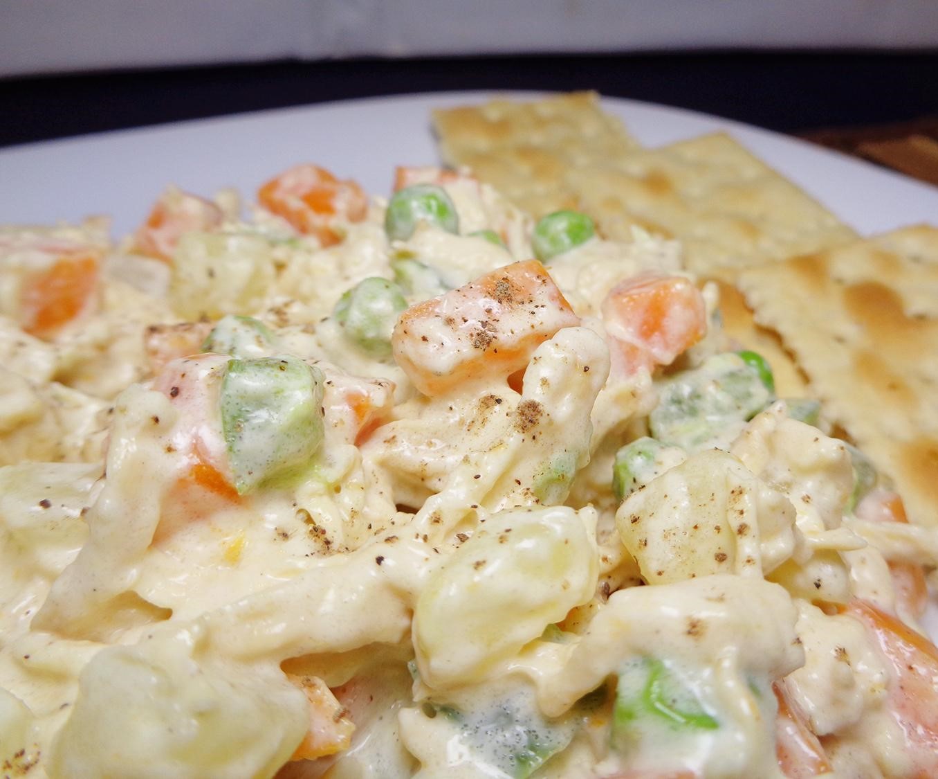 Ensalada mediana elaborada con papa, zanahoria, chícharos, mayonesa y pollo, se acompaña con chile jalapeño y galletas soda.
