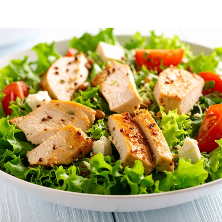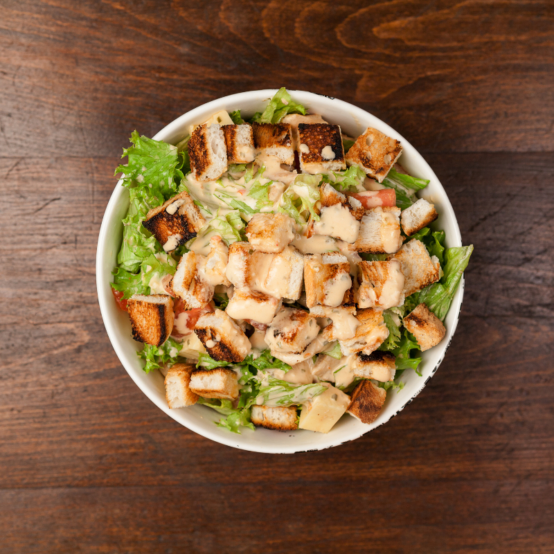 Pollo roasted, queso parmesano, tomates, crutones, lechuga italiana. Aderezo césar.