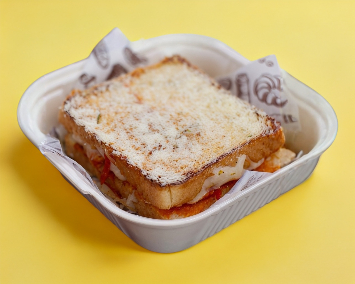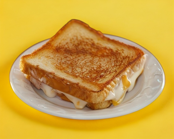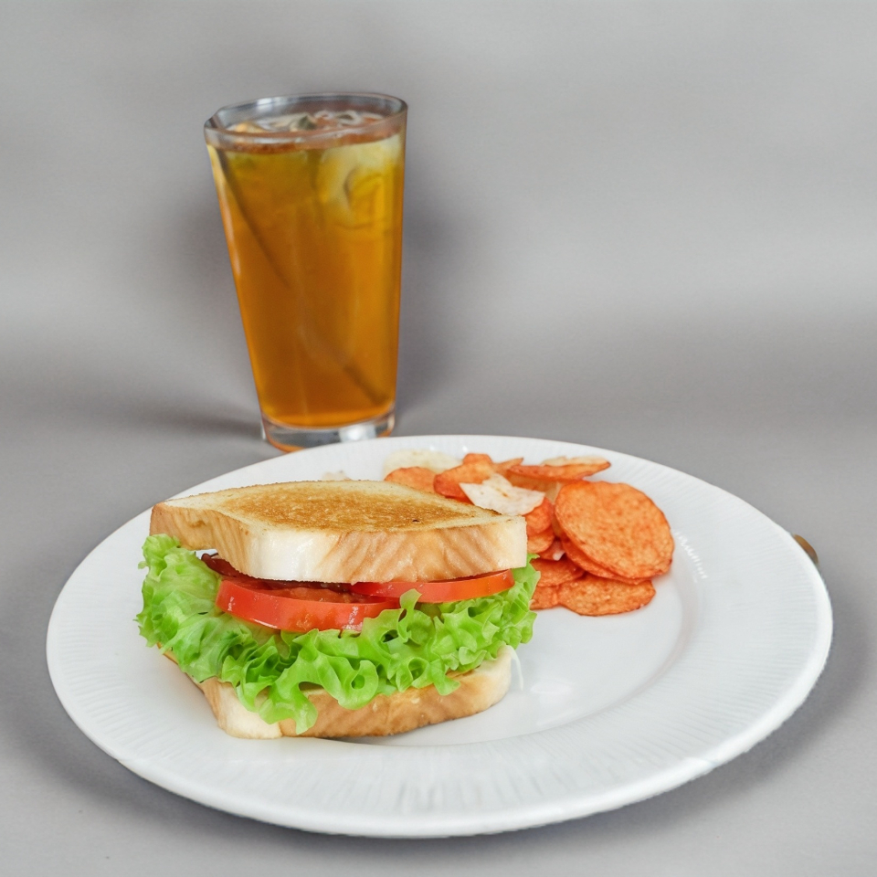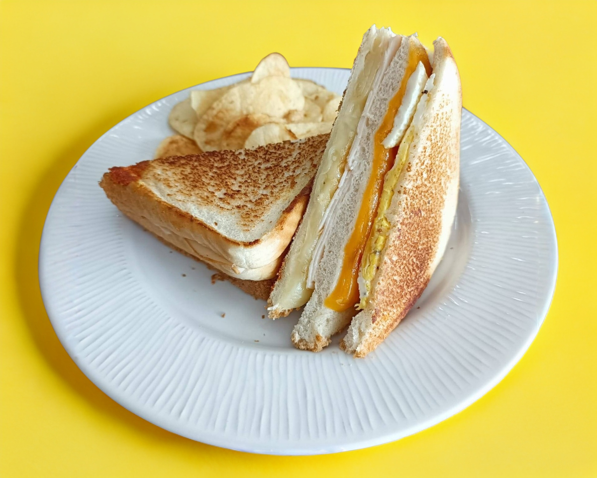 Sandwich doradito con mantequilla, de dos pisos, con dos tipos de queso (cheddar y monterrey jack), doble jamon y huevito. Acompañado de papas chips y bebida fria