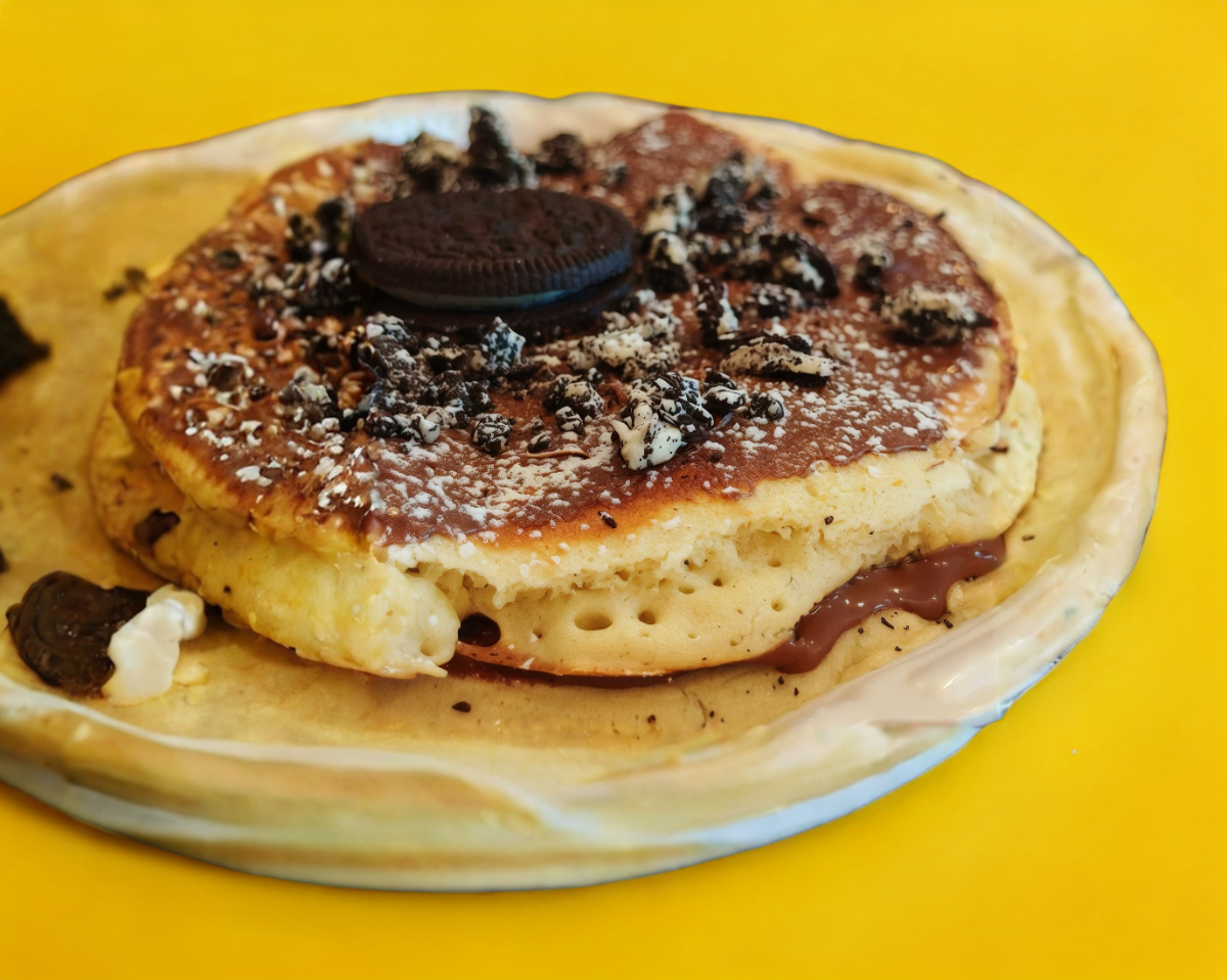 Deliciosos hotcakes grandes con relleno de oreo y nutella. Con topping de más oreo