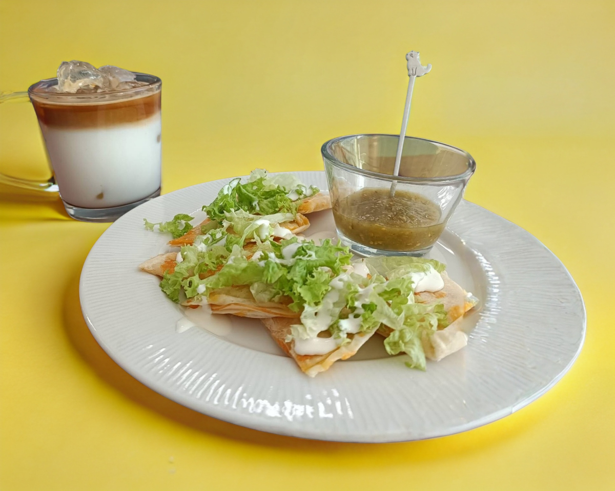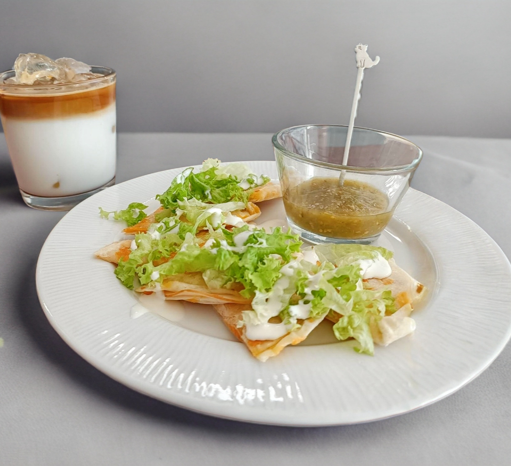 Trés quesadillas rellenas de queso monterrey jack, acompañadas de lechuga y media crema