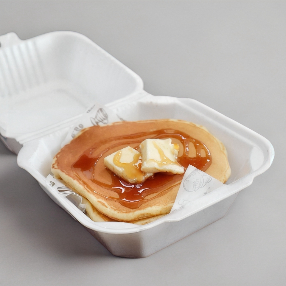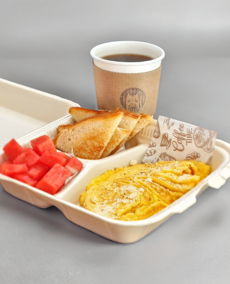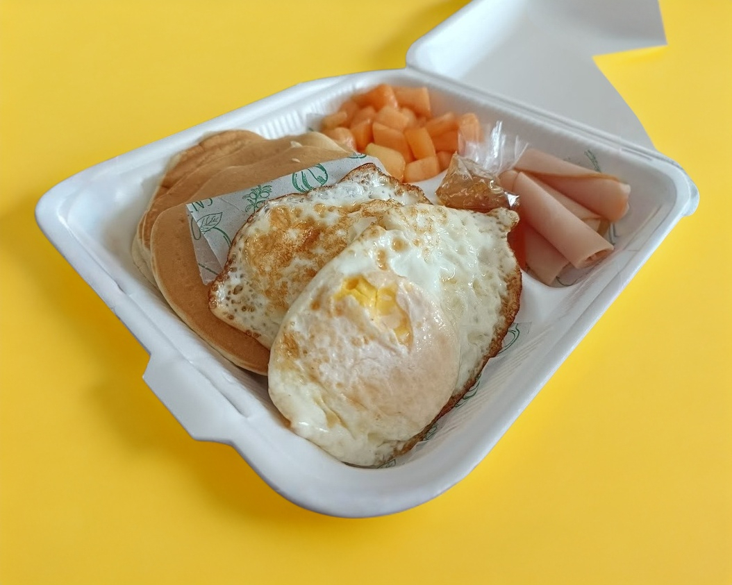 Incluye 2 Hotcakes, 2 Huevos, 2 Rebanadas de Jamón de Pollo Rostizado, Fruta y una bebida caliente.