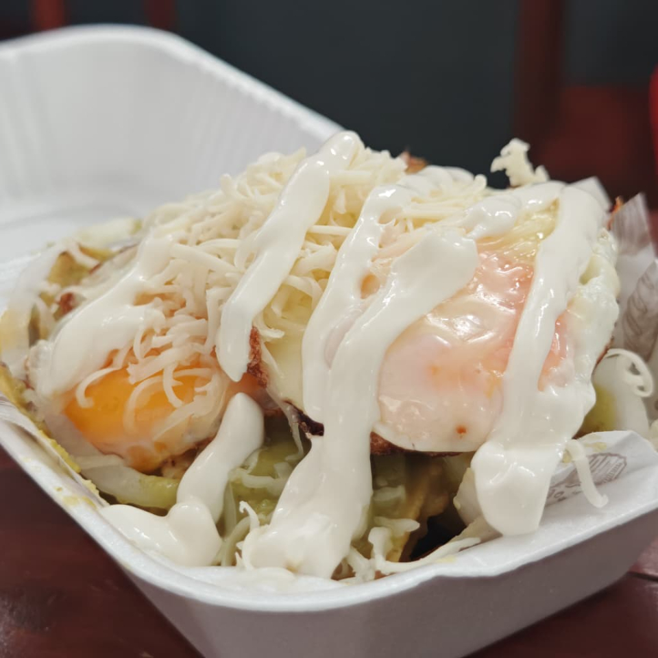 Orden de chilaquiles con salsa verde, queso Monterrey Jack, cebolla y una proteina a elegir