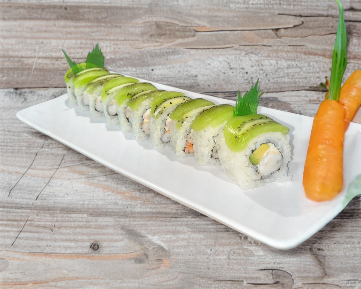 Relleno de surimi, camarón o salmón, queso crema y pepino. Cubierto de rebanadas de kiwi