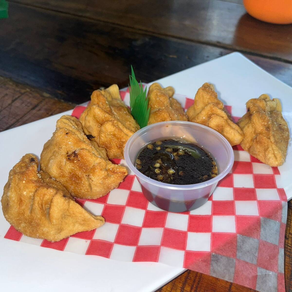Orden de seis empanadas estilo japones fritas rellenas de carne de cerdo y verduras.