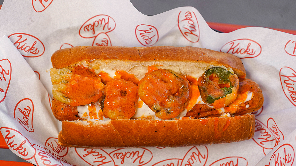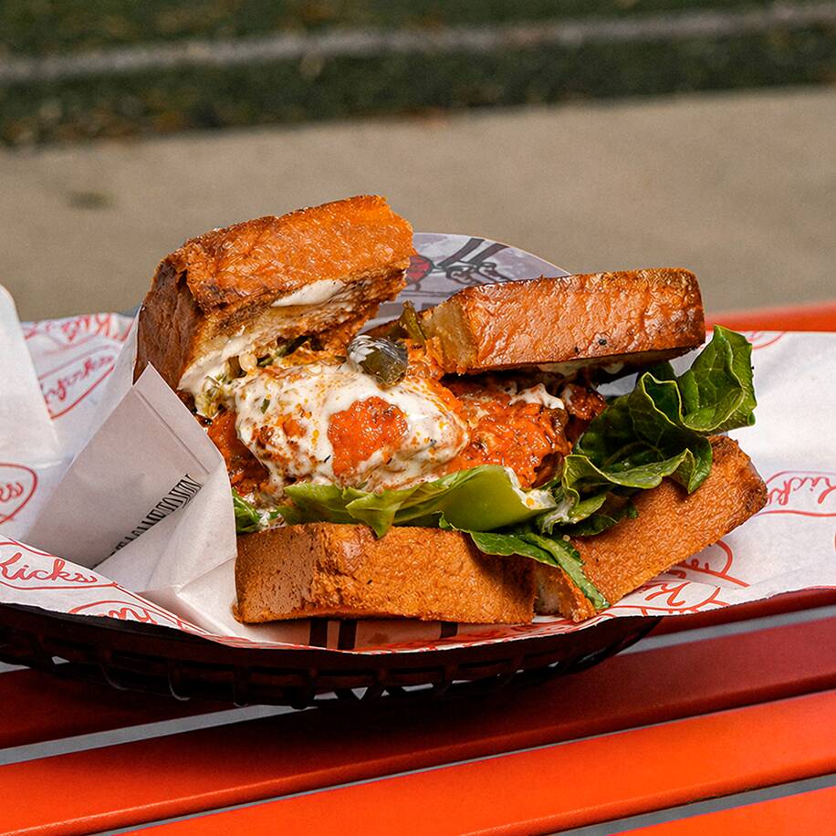 Pan brioche, pechuga de pollo frita bañada en salsa buffalo, lechuga bañada en ranch de la casa y jalapeños tatemados.