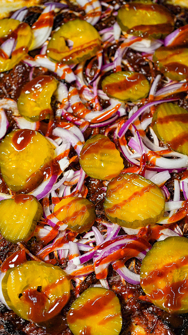 Pizza estilo detroit. SalsaBBQ dela casa, pulled pork, queso mozzarella, coronada con cebolla morada y pepinillos.