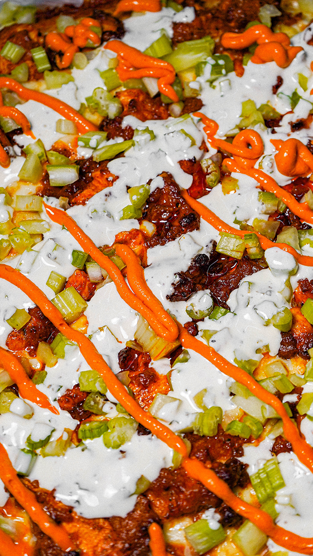 Pizza estilo detroit. Queso mozzarella, ranch hecho en casa, boneless bañados en salsa buffalo y apio.