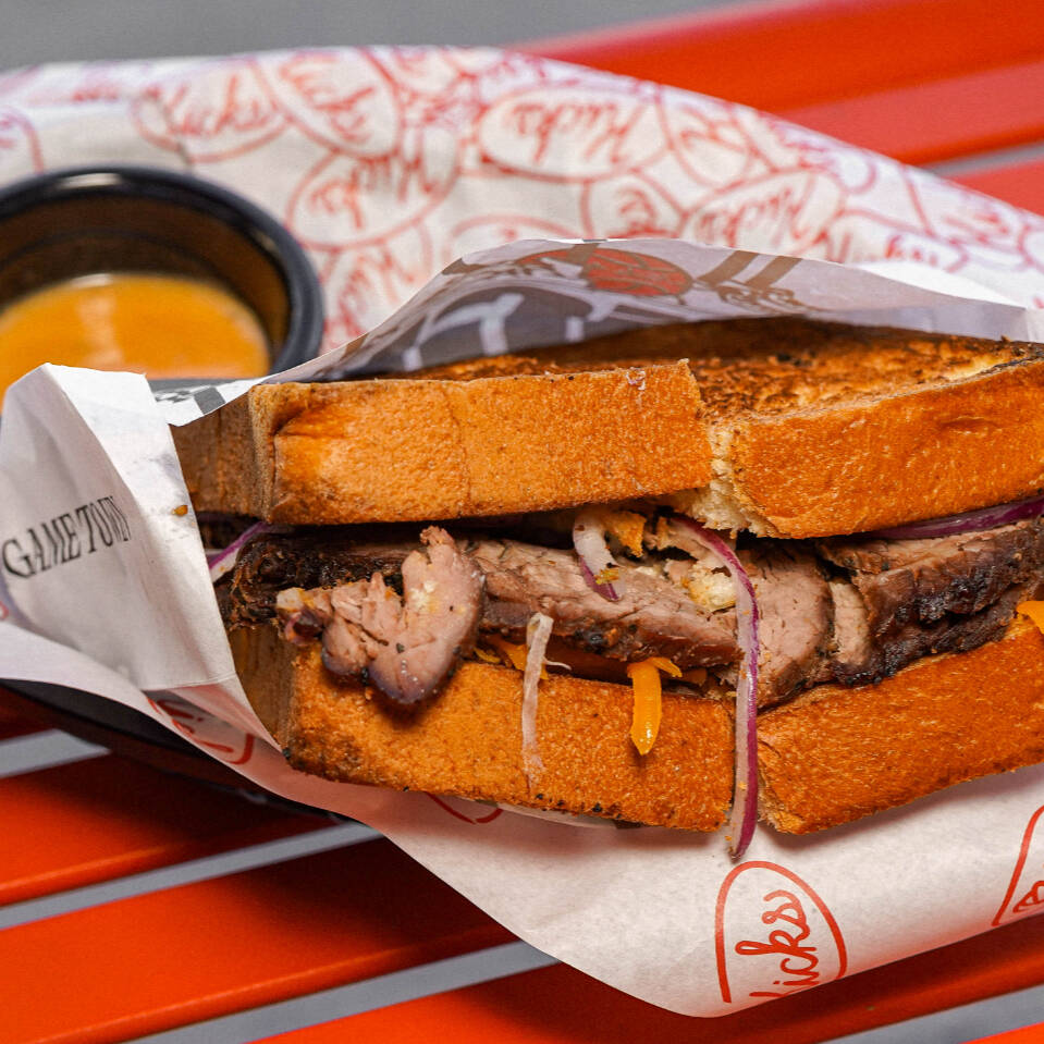Pan brioche, roastbeef hecho en casa, queso cheddar, aderezo mil islas y cebolla morada.