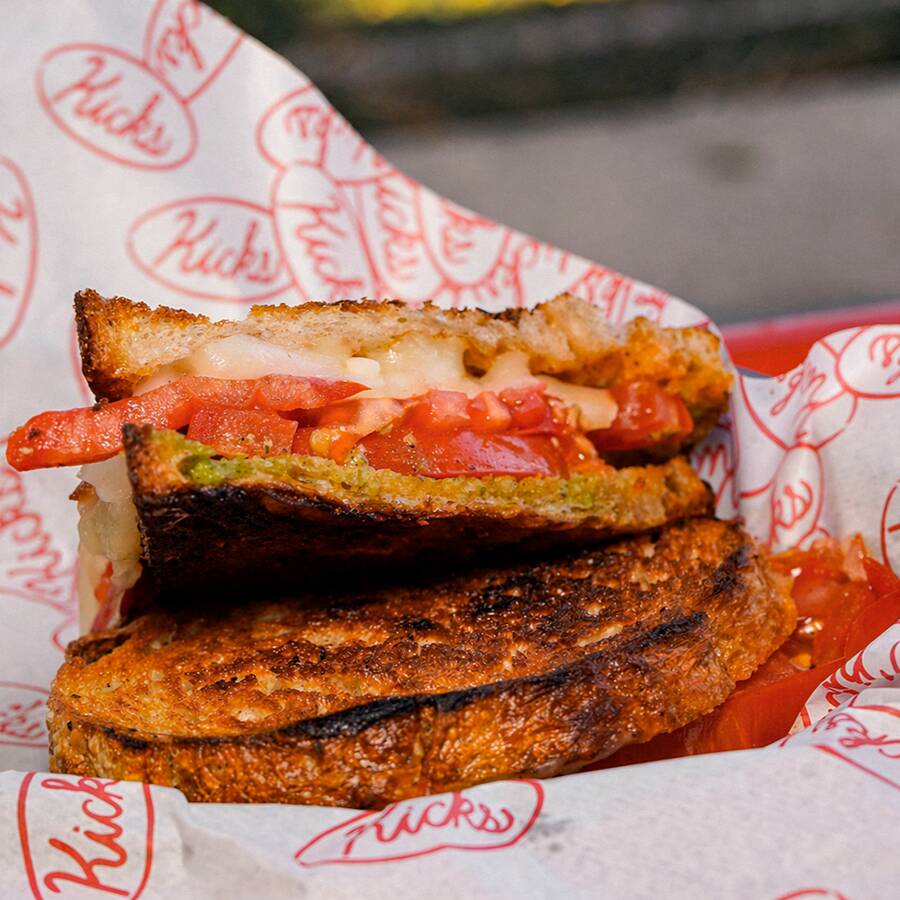 Pan brioche relleno de queso mozzarella, tomate bola, pesto de albahaca, arúgula y queso parmesano.