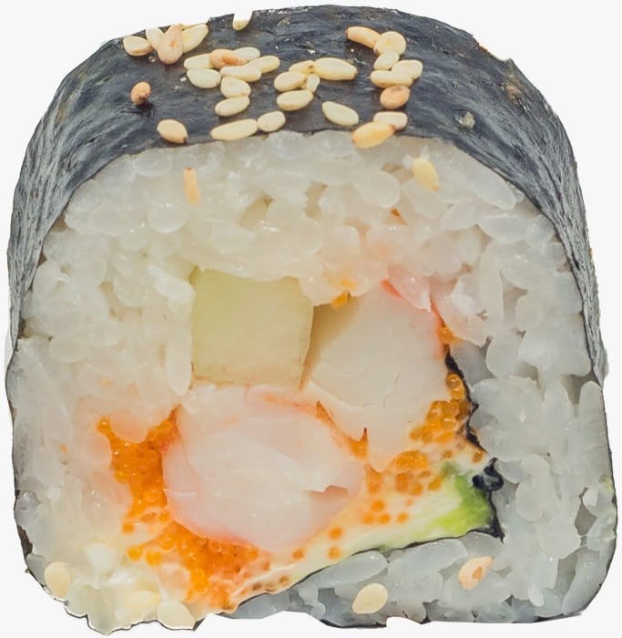 PF- alga y ajonjoli PD- camaron, surimi, pepino, masago, aguacate y philadelphia