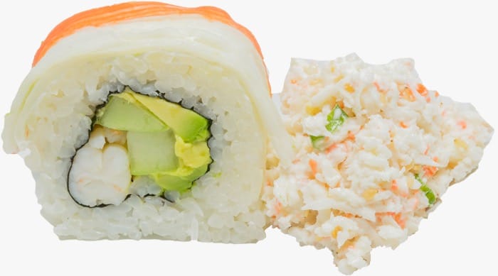 arroz al vapor cubierto con tampico y trozos de aguacate y philadelphia