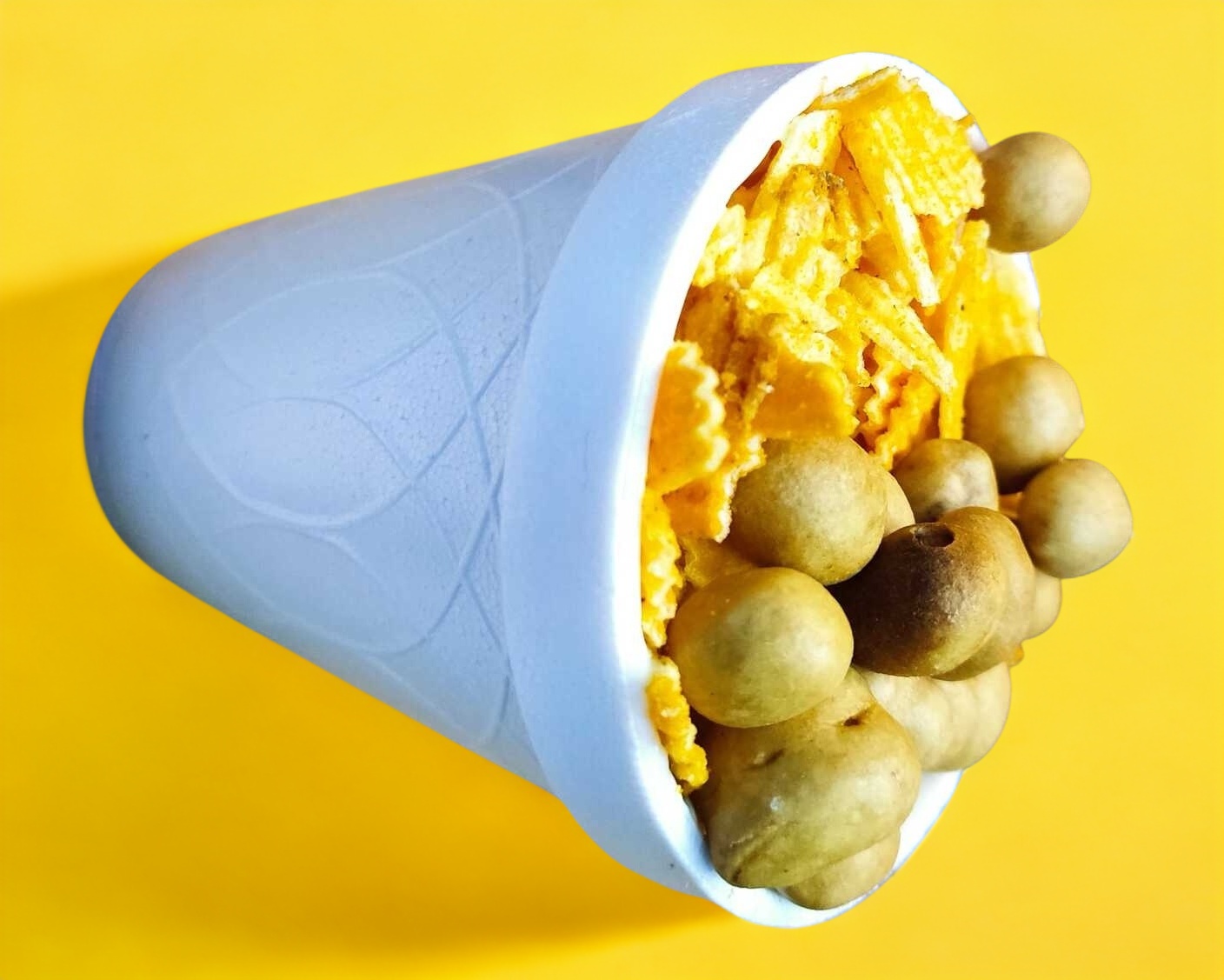 1 sabrita a elegir, porción de esquite, aderezos media crema, queso sopero, queso Nacho, 1 elote a la mitad y 2 toppigns