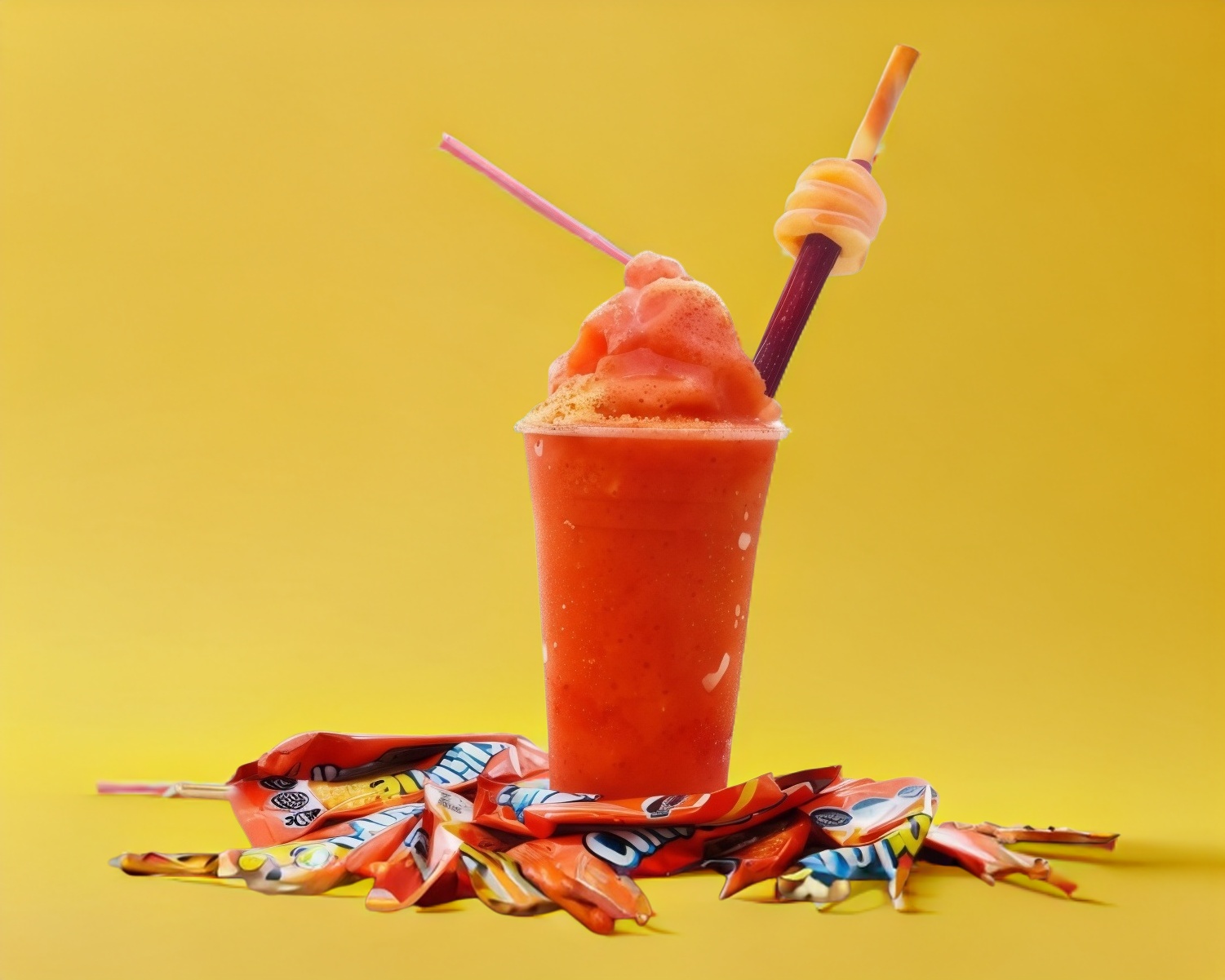 Smoothie sabor pica fresa con chamoy, acompañado de su banderilla de tamarindo.