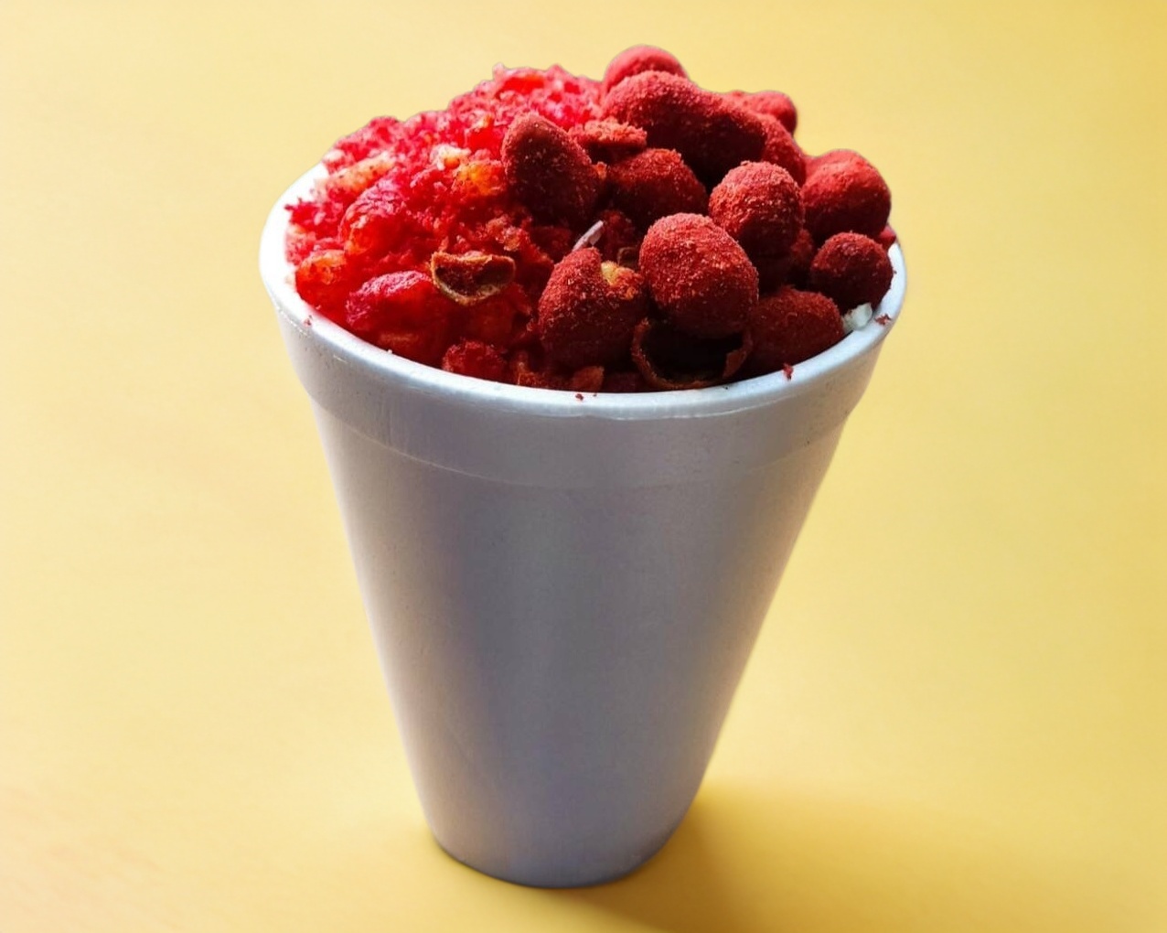 Elote desgranado con crema o mayonesa y chilito molido.