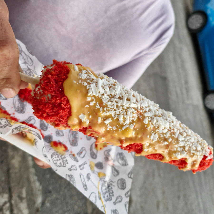 Elote entero con media crema o mayonesa empanizado con tu sabrita preferida