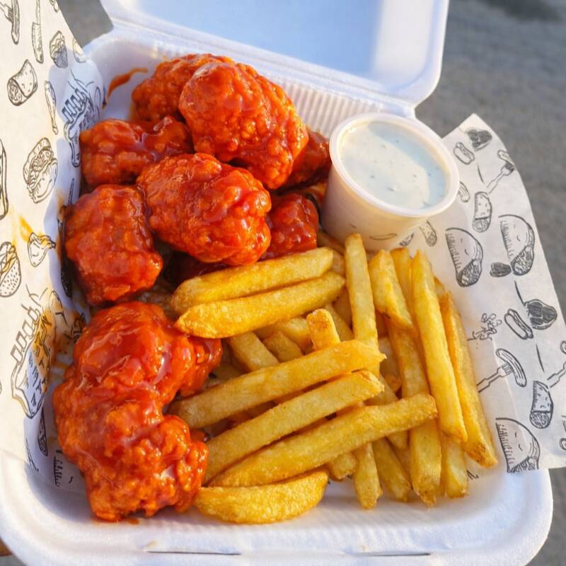 Deliciosos bonneles crujientes por fuera y jugosos por dentro, bañados en salsa a elegir. Acompañdos de papas a la francesa y aderezo ranch
