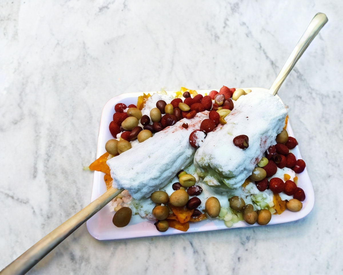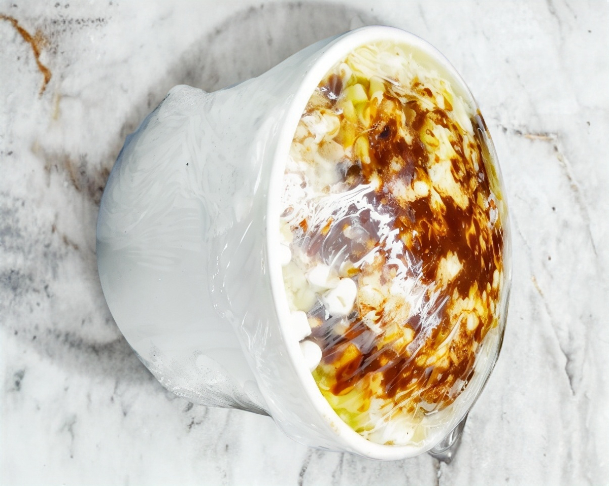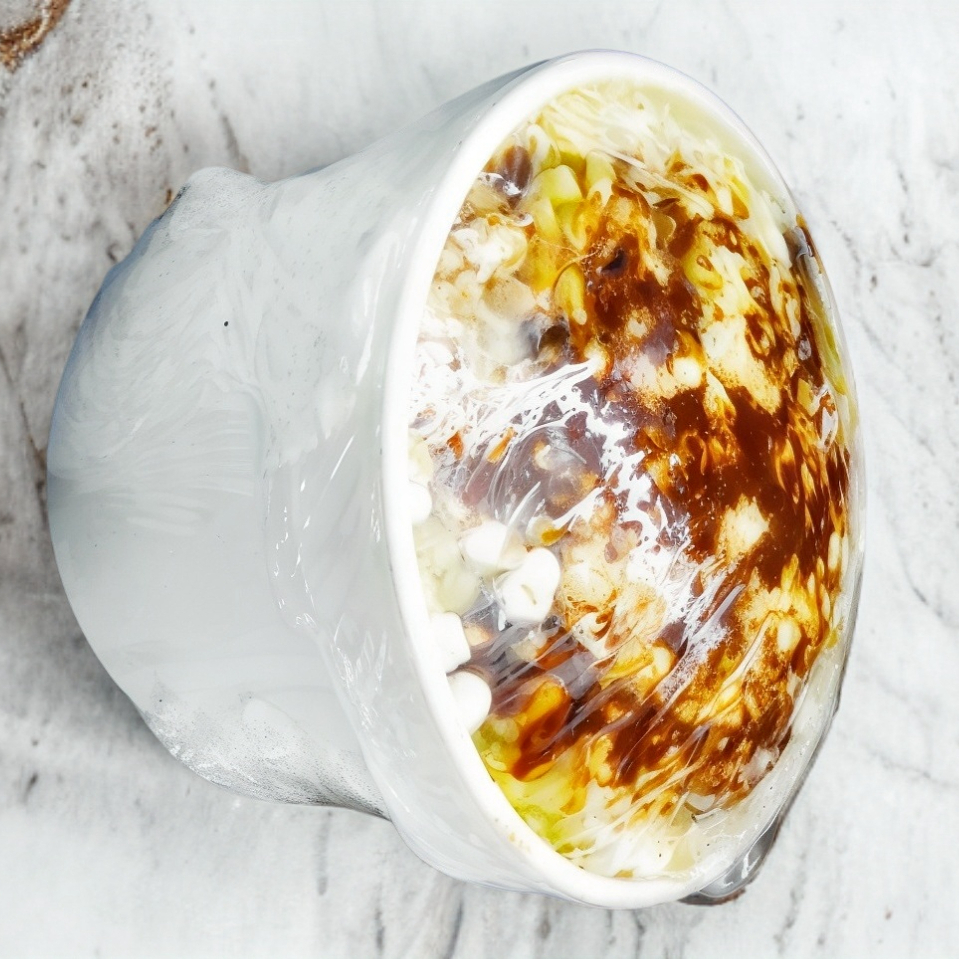 Elote desgranado con crema o mayonesa y chilito molido.
