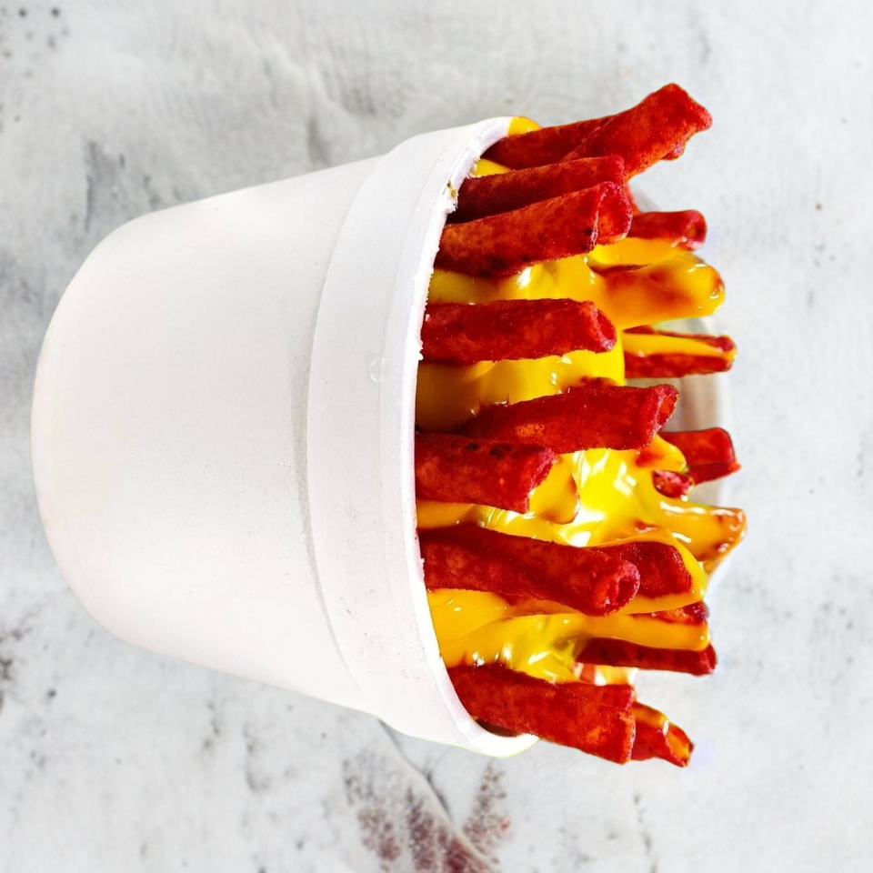 Elote entero con media crema o mayonesa empanizado con chetos flamin hot.