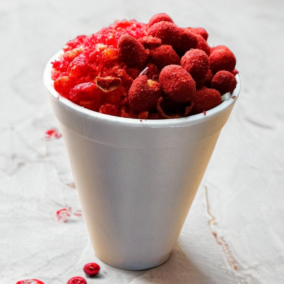 Pulpa de fresa y fresa natural con chamoy líquido y polvo.