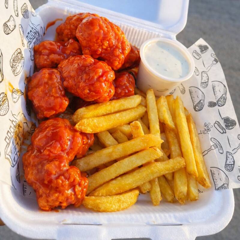 Deliciosos bonneles crujientes por fuera y jugosos por dentro, bañados en salsa a elegir. Acompañdos de papas a la francesa y aderezo ranch