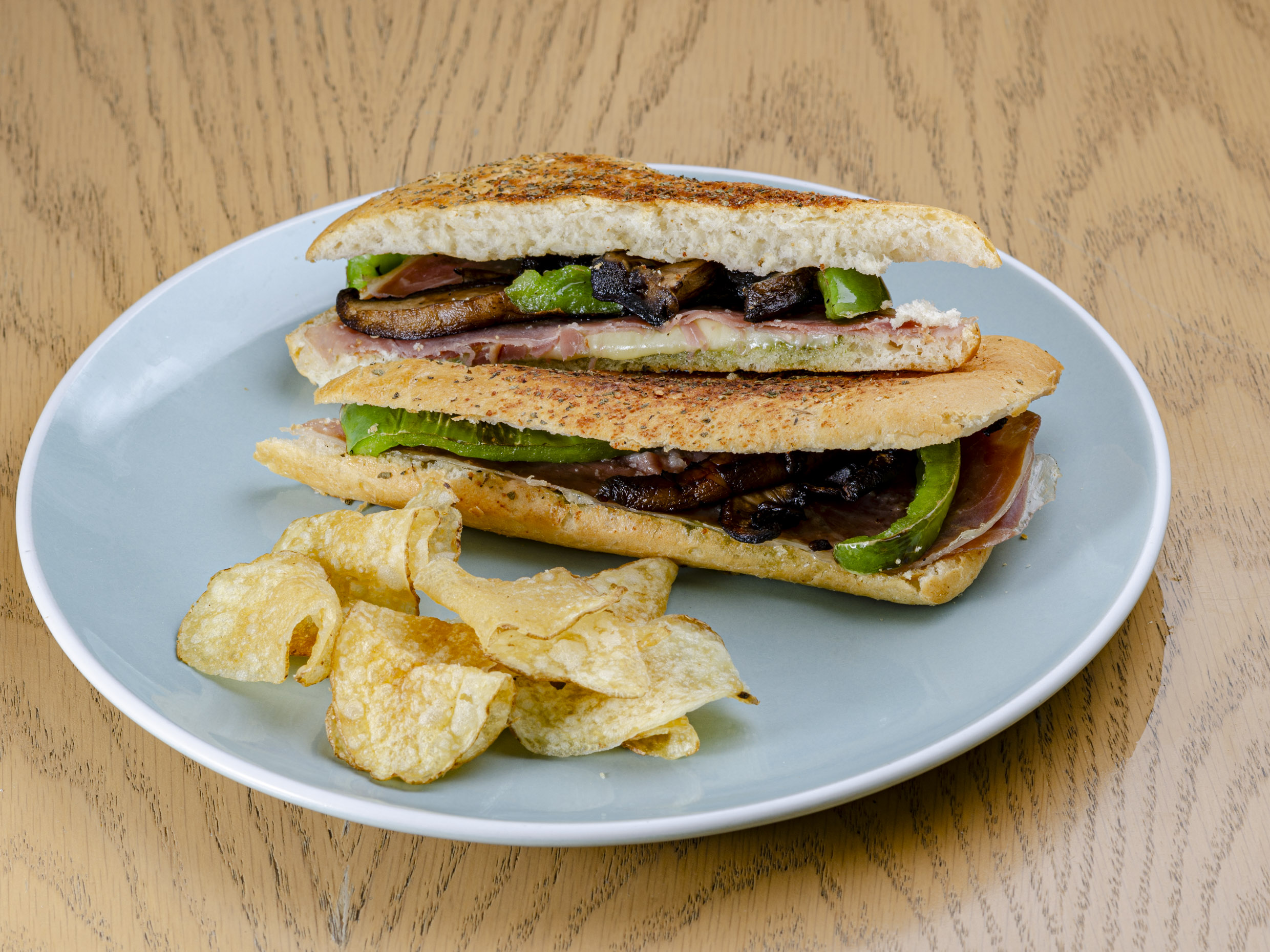 Pesto de albahaca, queso gouda, jamón serrano, pimiento verde y portobellos sauté.
