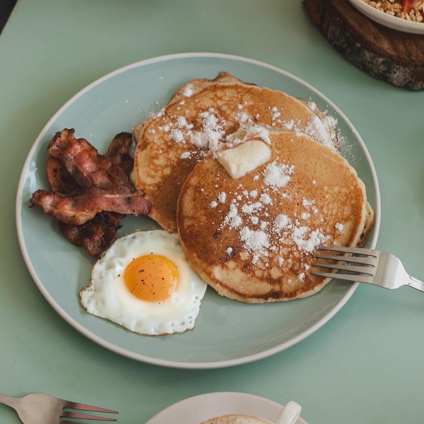 2 hotcakes/huevo estrellado/tocino