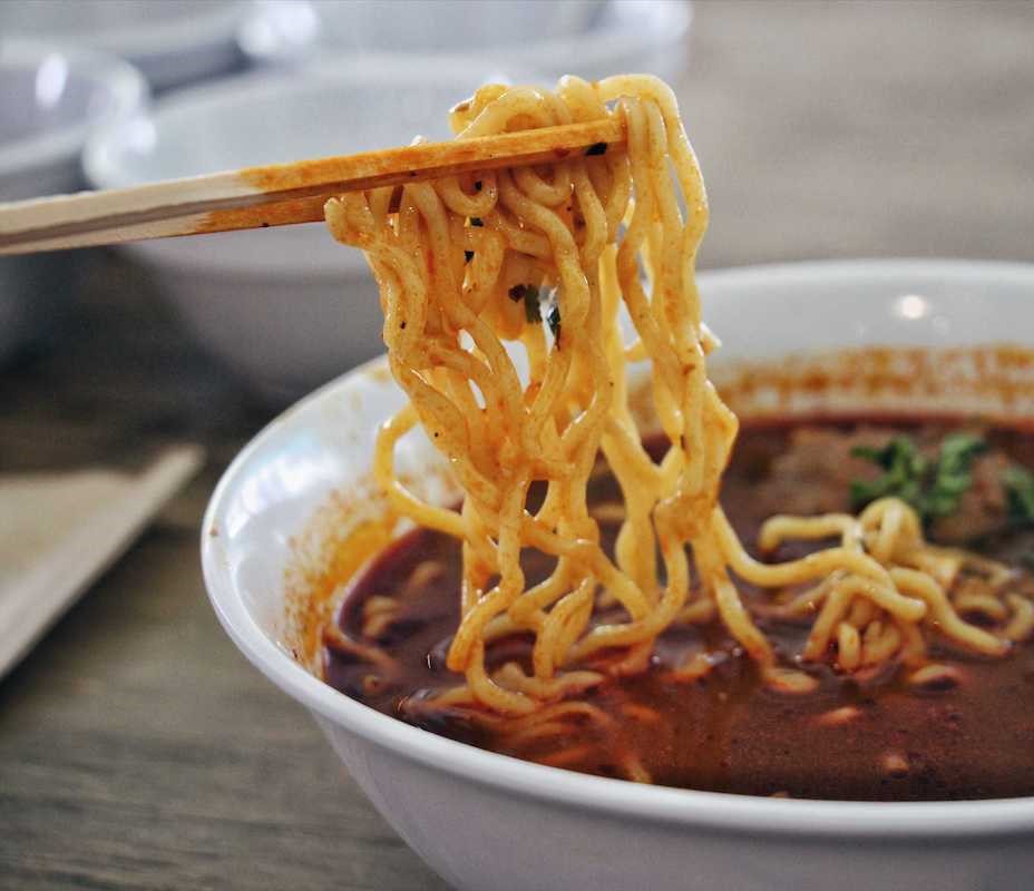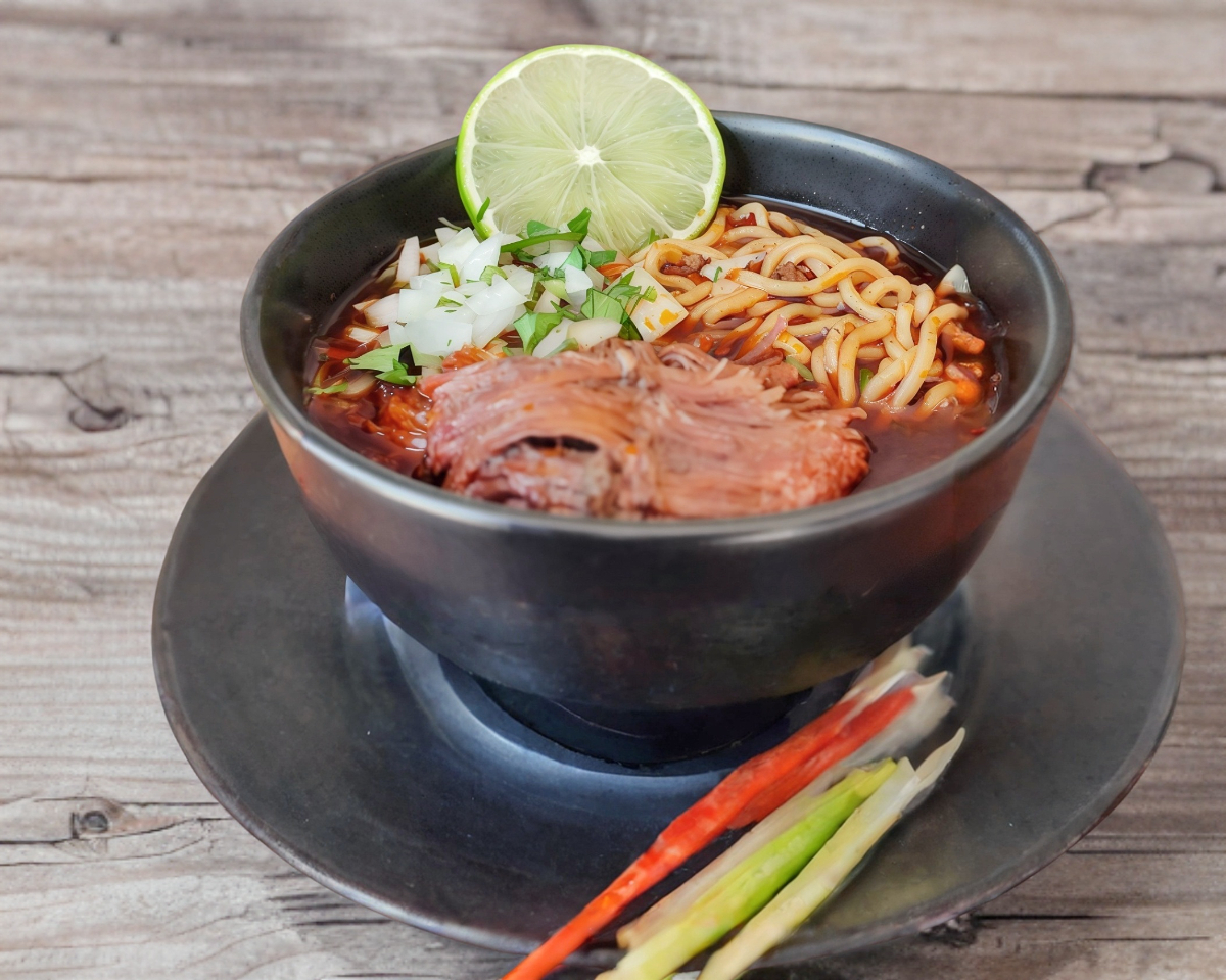 Pasta de ramen con carne en consomé de birria, cebolla, cilantro y limones.