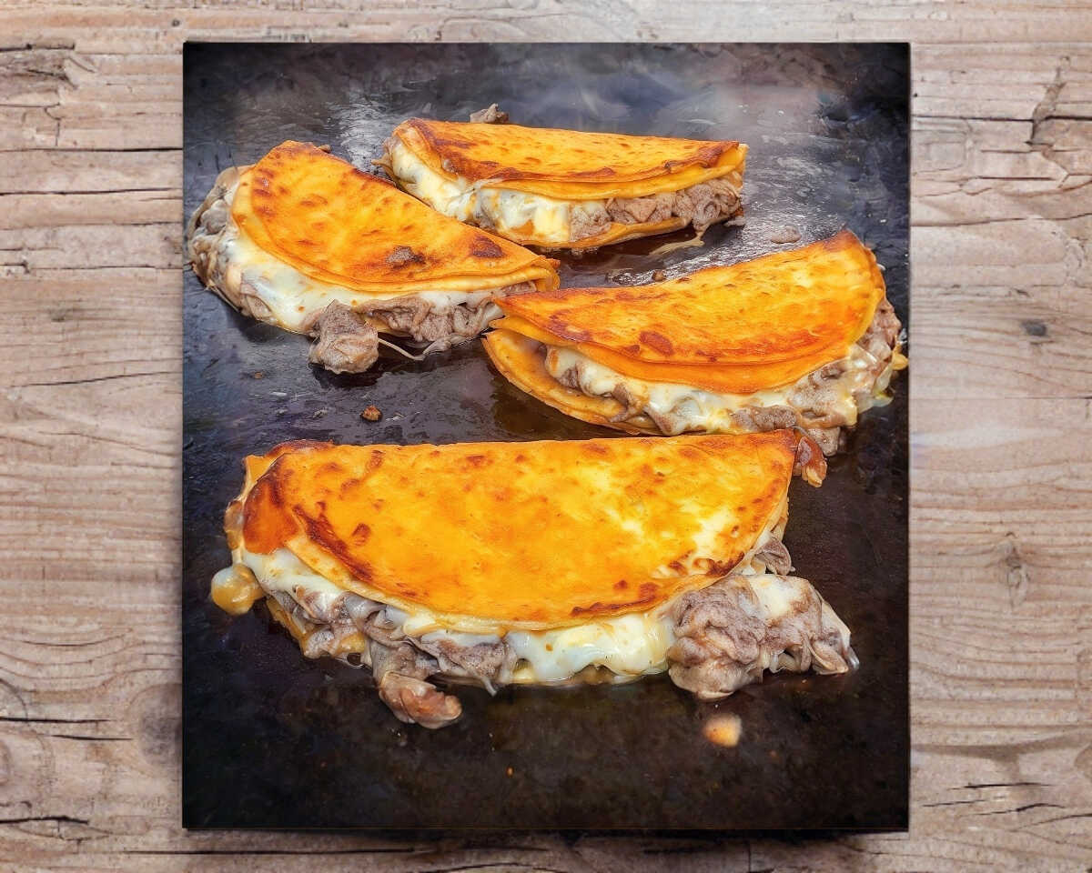 Taco de maíz con carne de birria y queso.