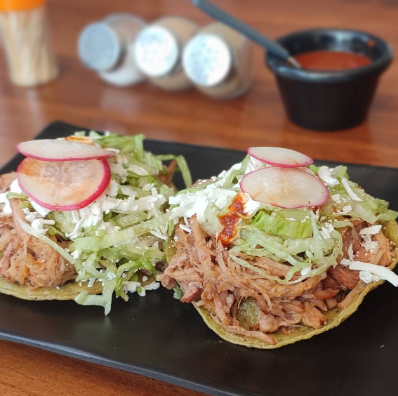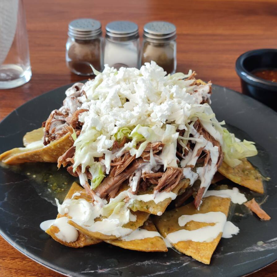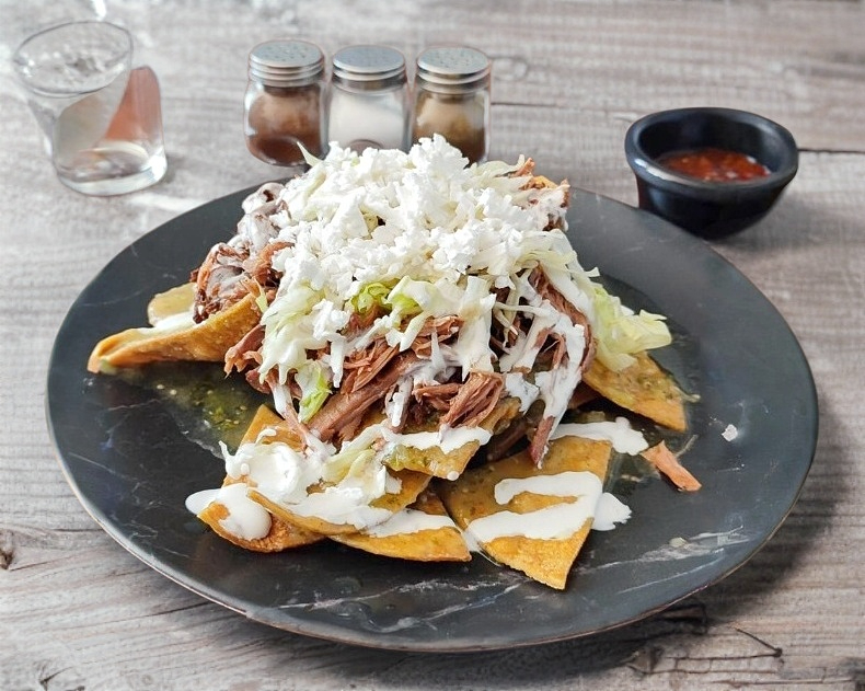 Tortilla de maíz frita bañada con consomé de birria y carne de birria, acompañado con cebolla, cilantro y limón.