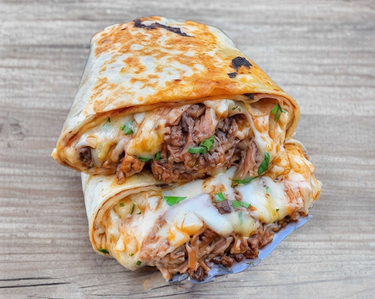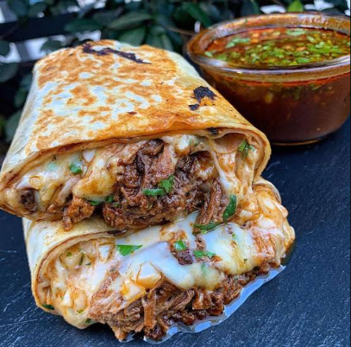 Burrito de tortilla de harina de 30 cm con carne de birria, consomé, cebolla, cilantro y limones.