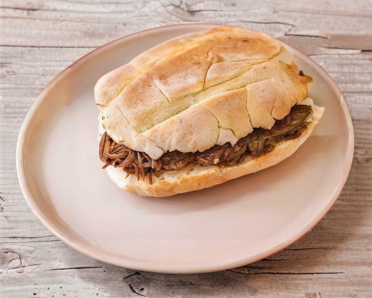 Bolillo con base frijol casero, con 125 gramos de carne de cerdo asada y jugosa, con cebolla caramelizada y acompañado de salsas roja y verde