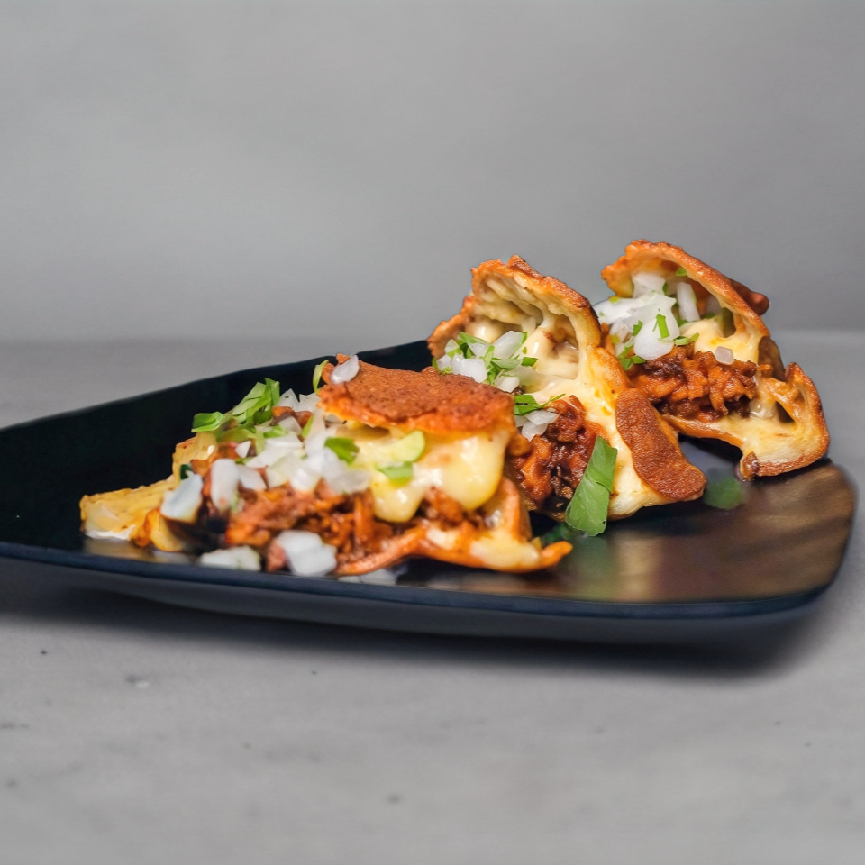 rebanada de pizza rellena de queso, carne de birria, cebolla y cilantro acompañado de consomé y salsas