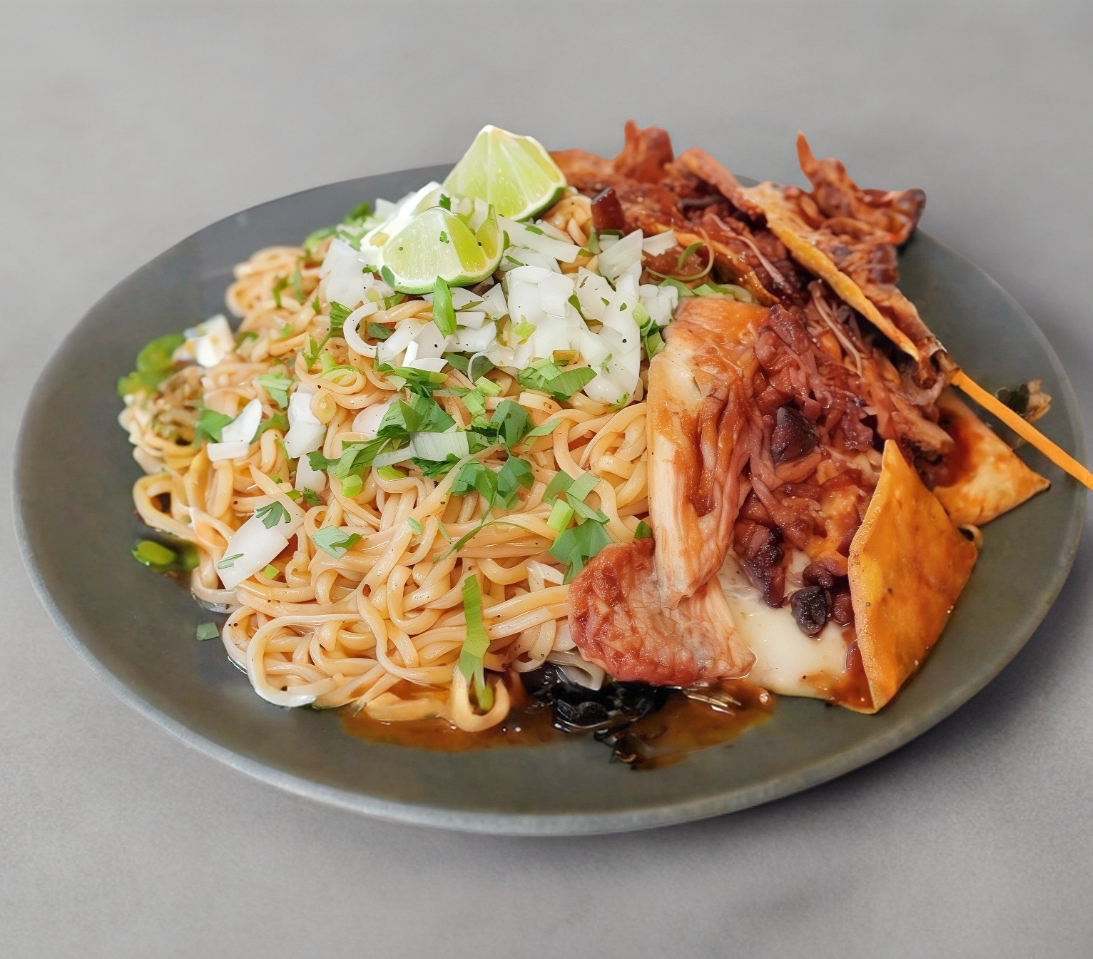 Ramen cocido en consomé de birria acompañado de 125 gramos de carne acompañado de cebolla cilantro limon y salsa roja