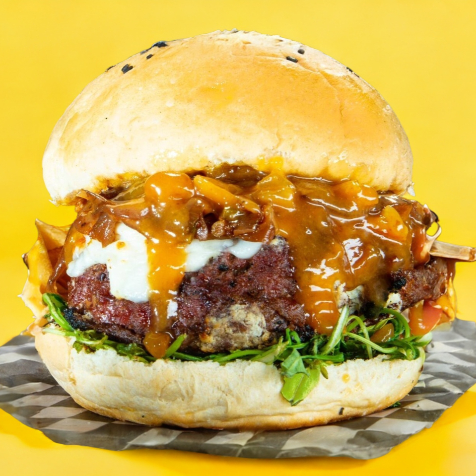 Hamburguesa de res con pan brioche, salsa agridulce de cacahuate, tocino, cebolla caramelizada, queso, espinacas y papas a la francesa.